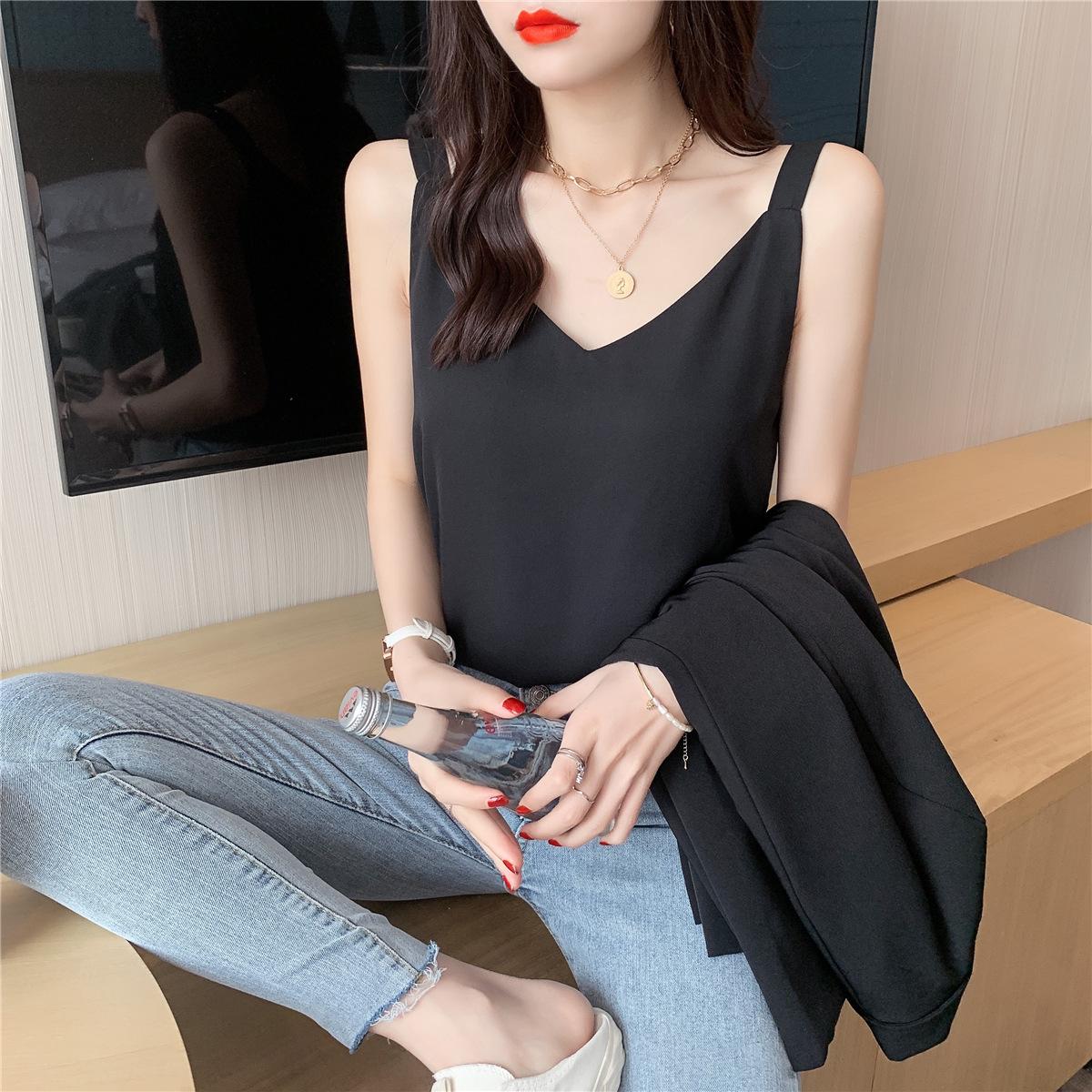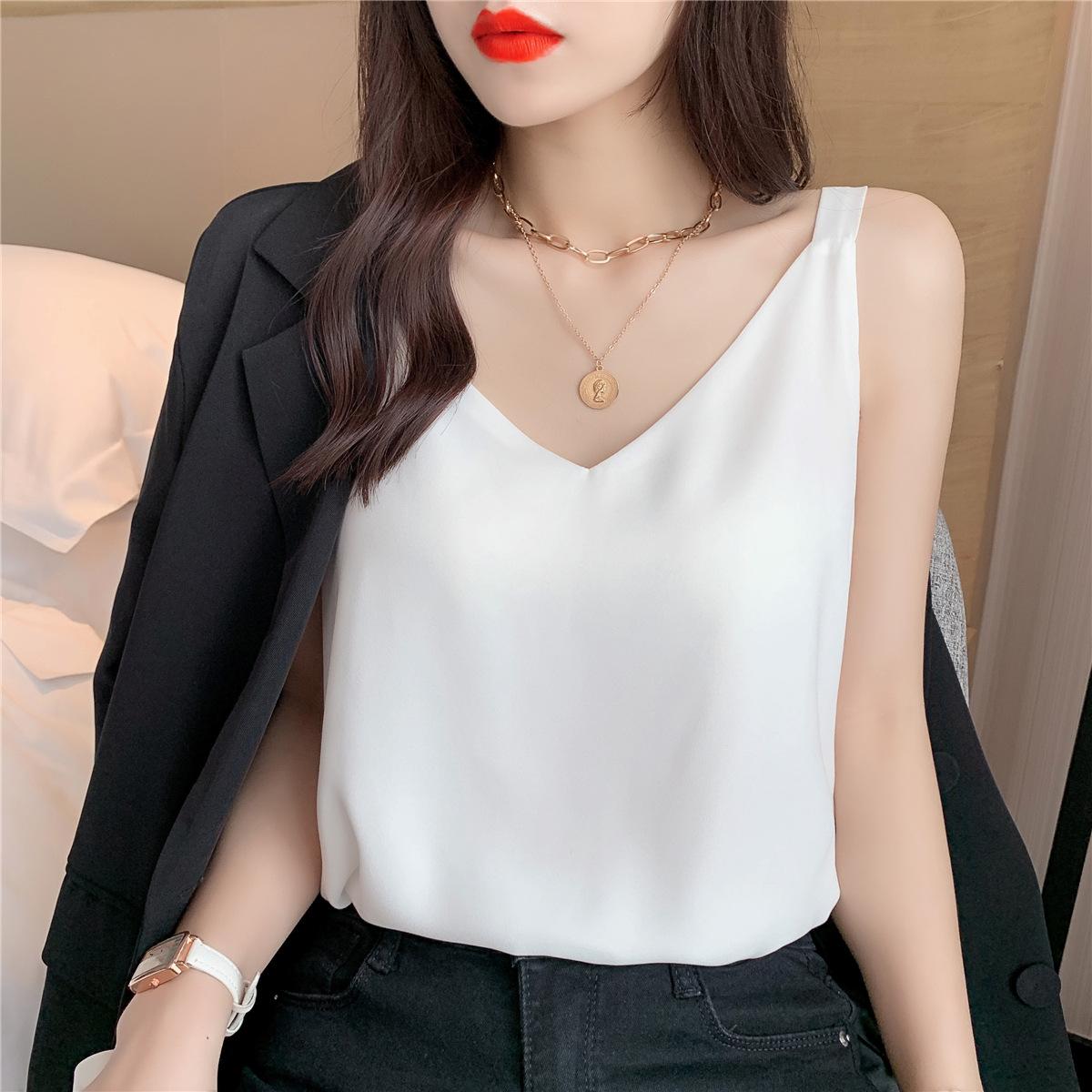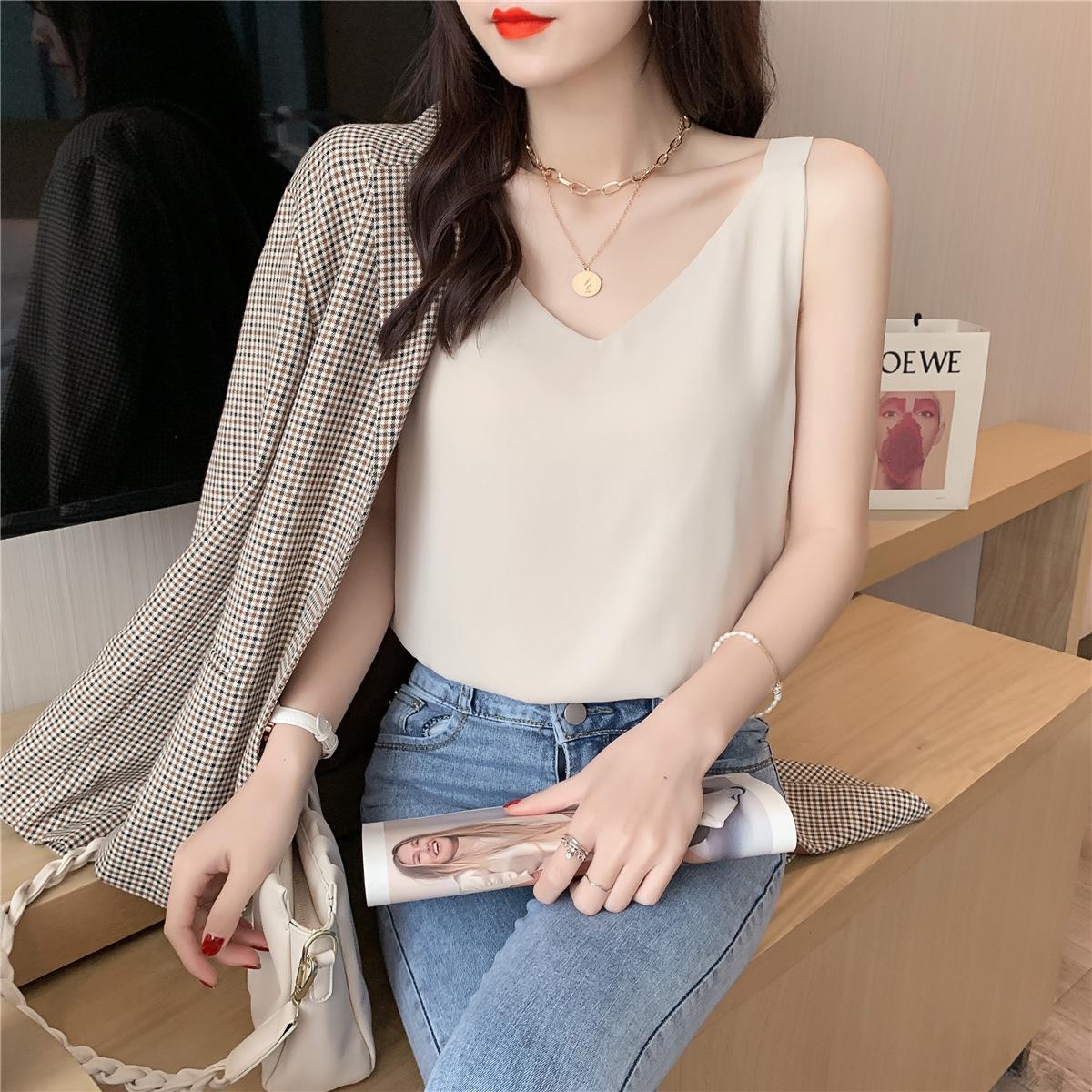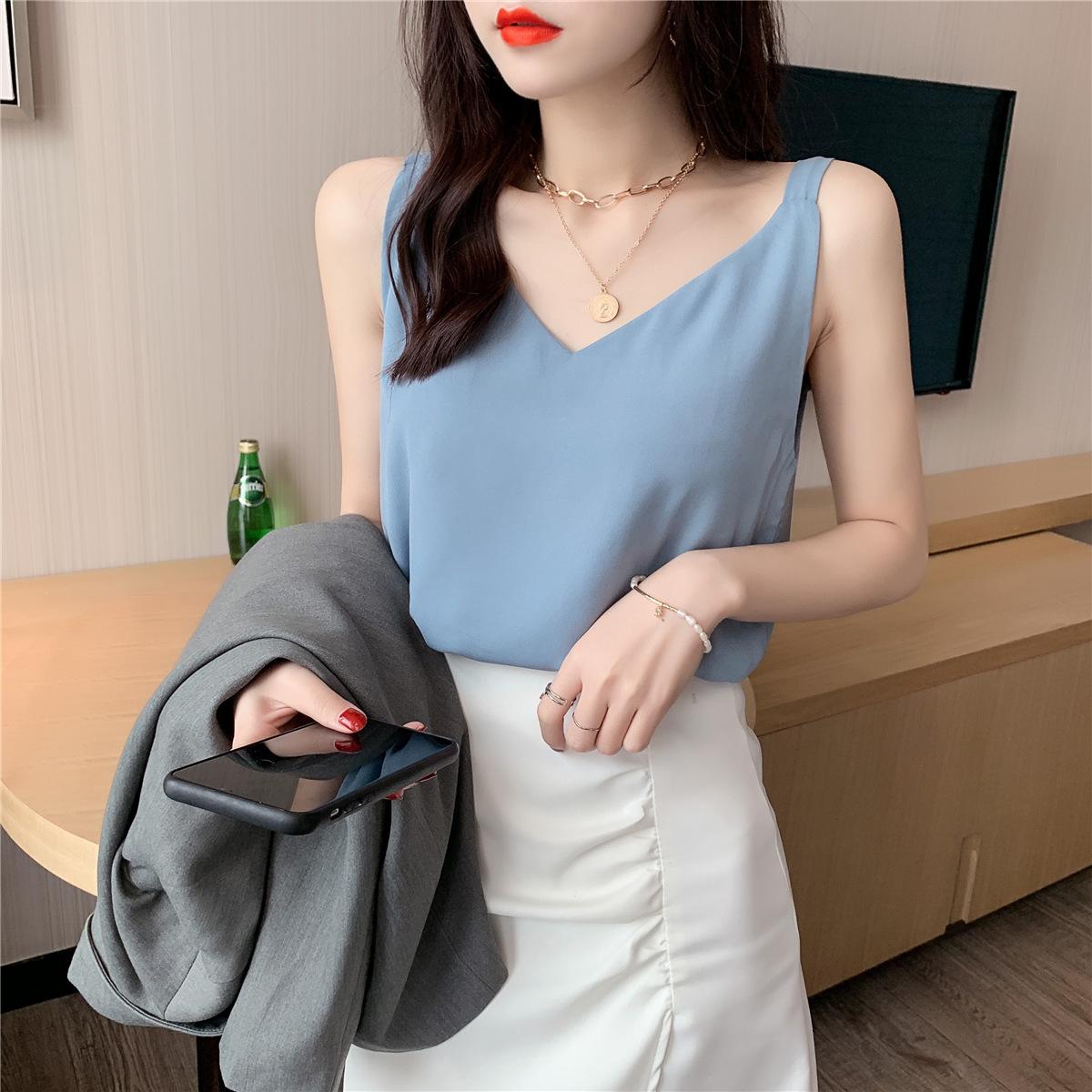 Camisola de gasa para mujer, novedad de verano 2024, con escote en V, doble capa, holgada, ajustada, interior blanca.