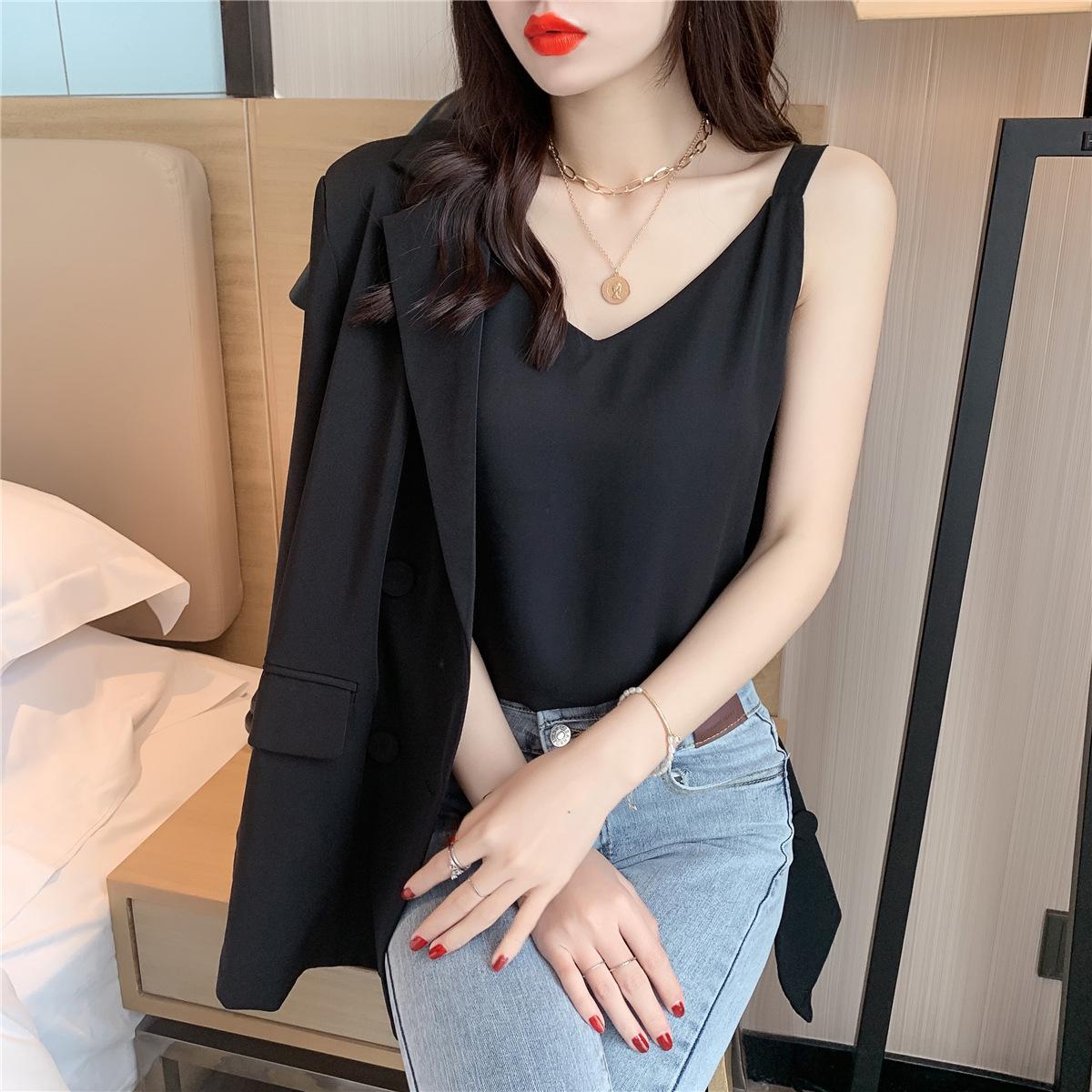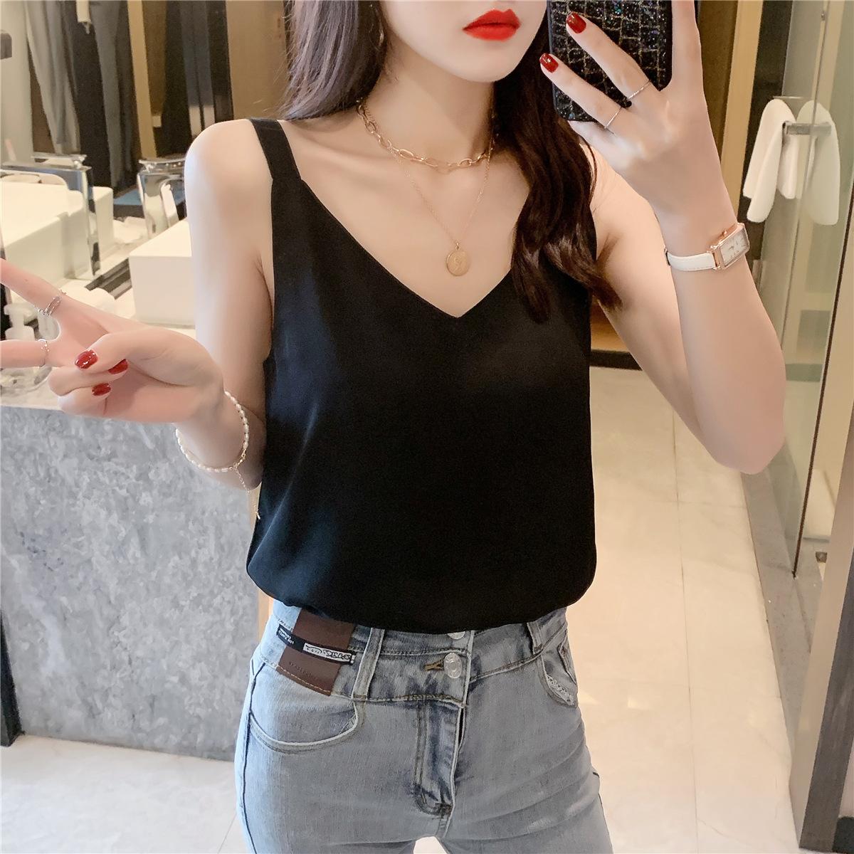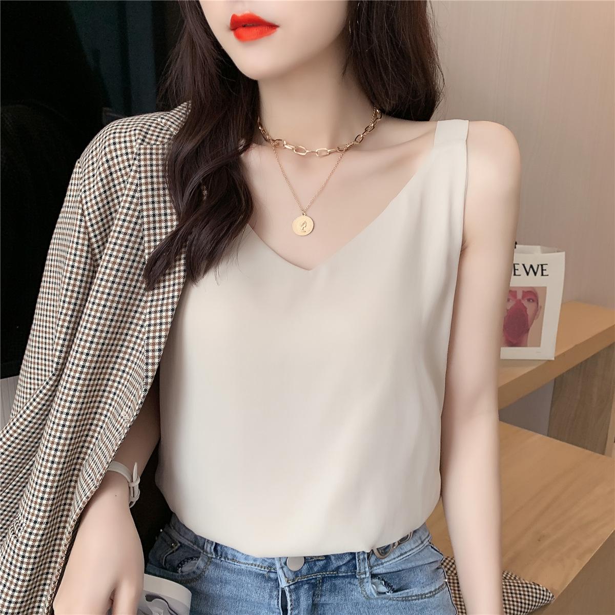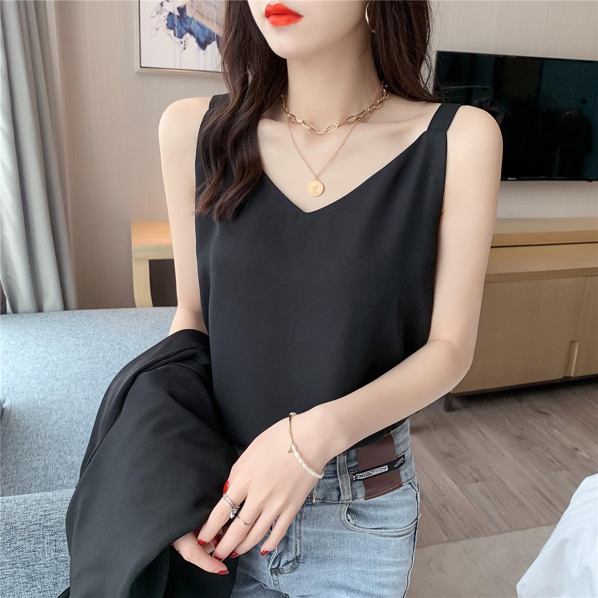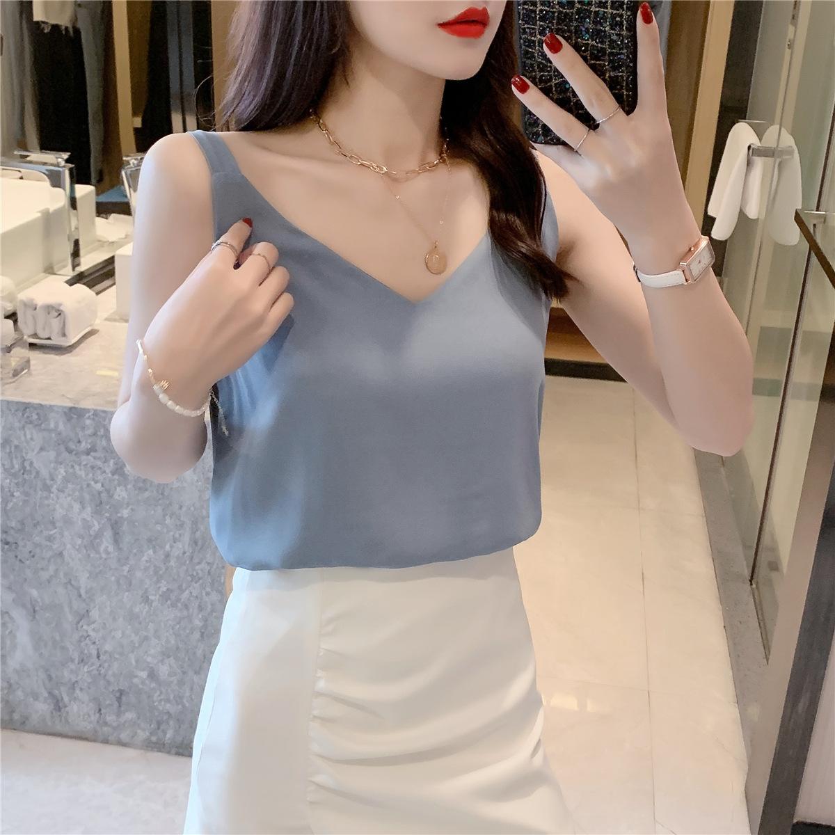 Camisola de gasa para mujer, novedad de verano 2024, con escote en V, doble capa, holgada, ajustada, interior blanca.