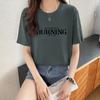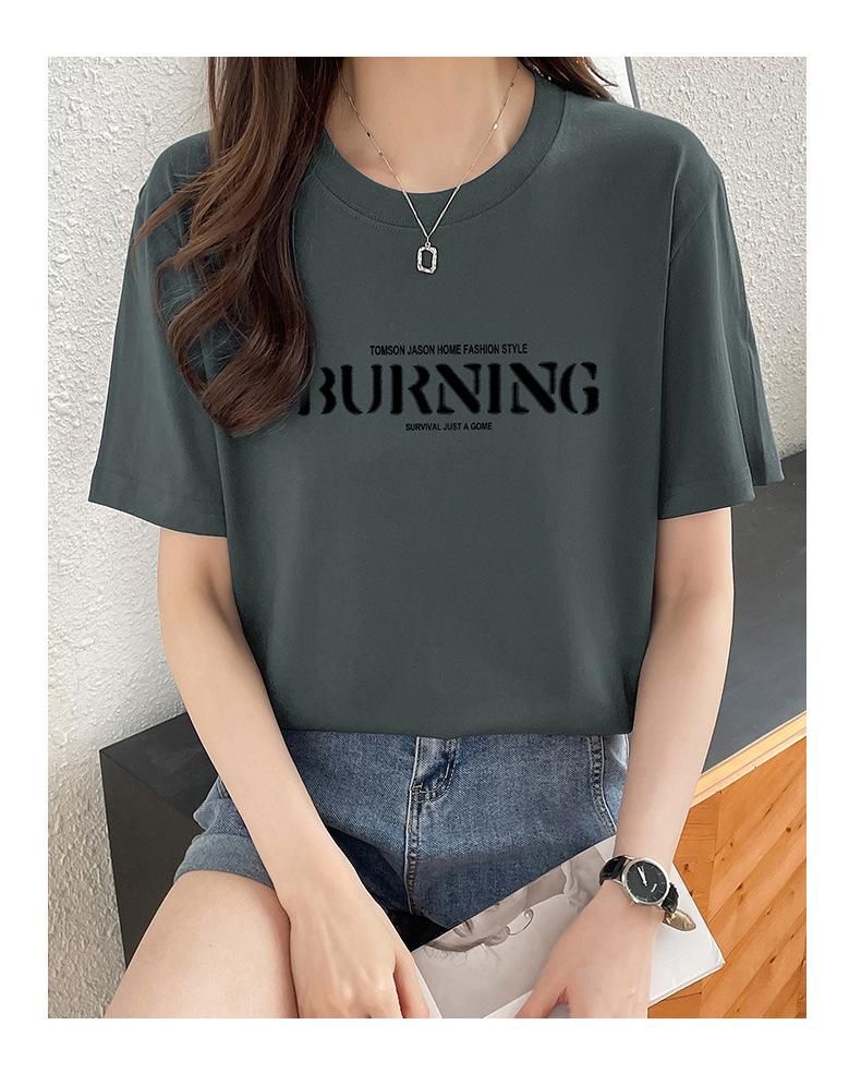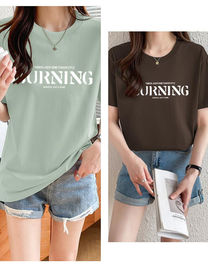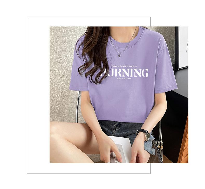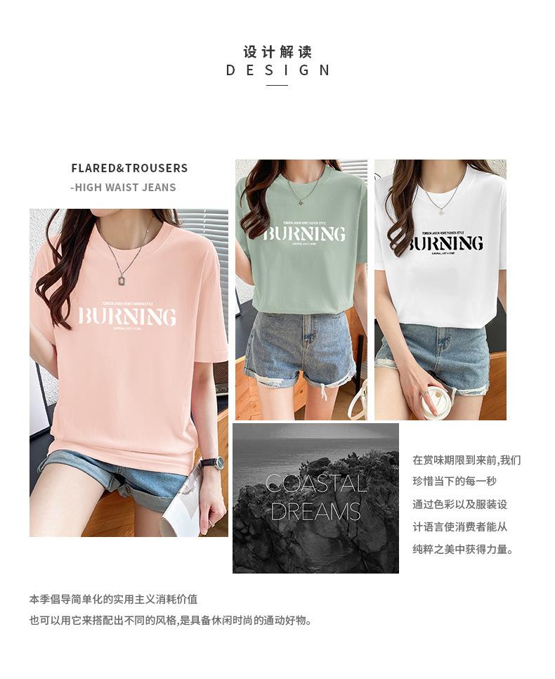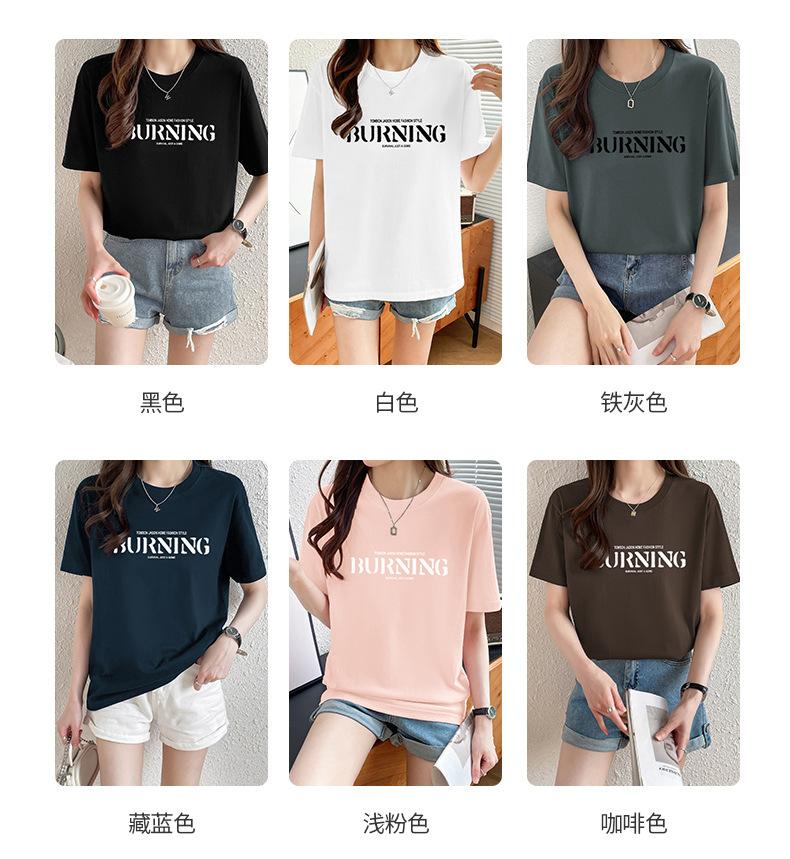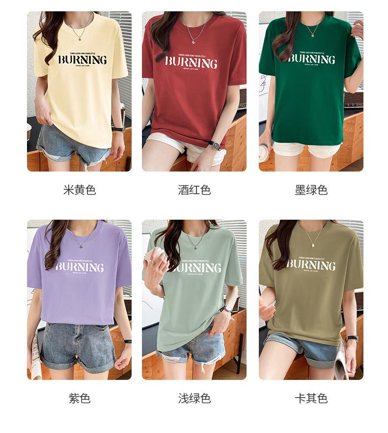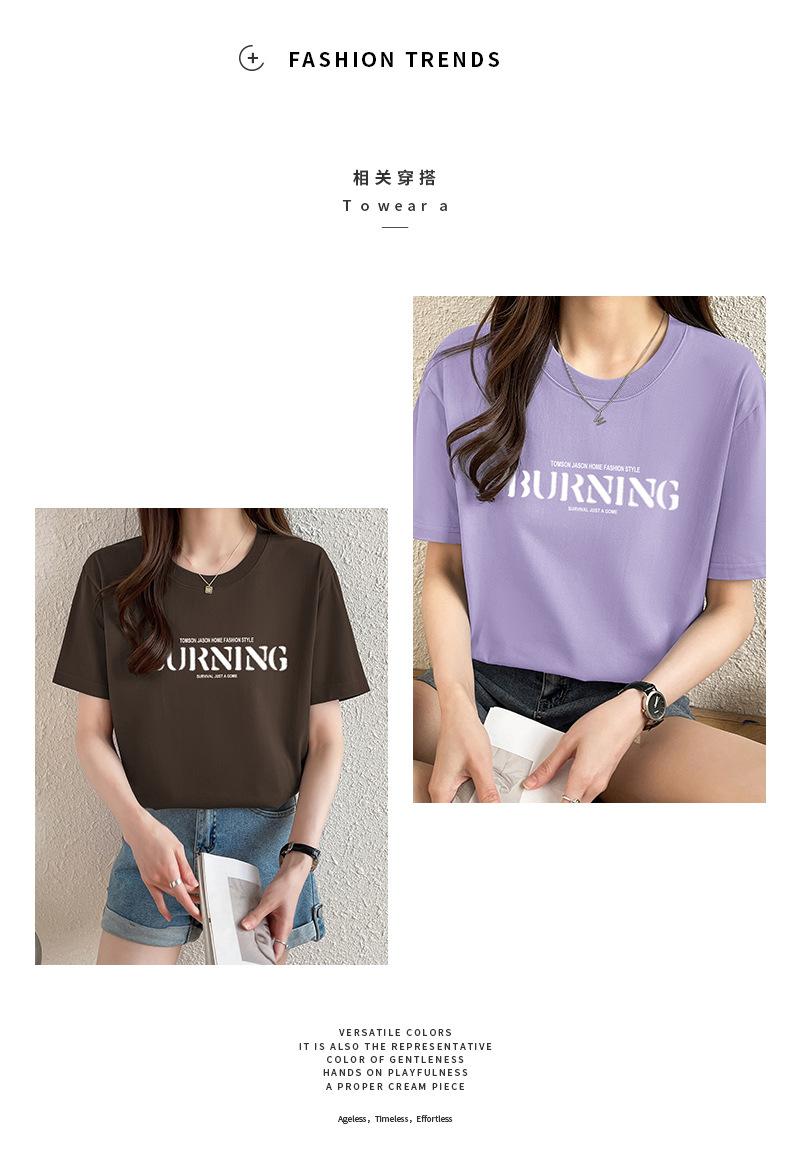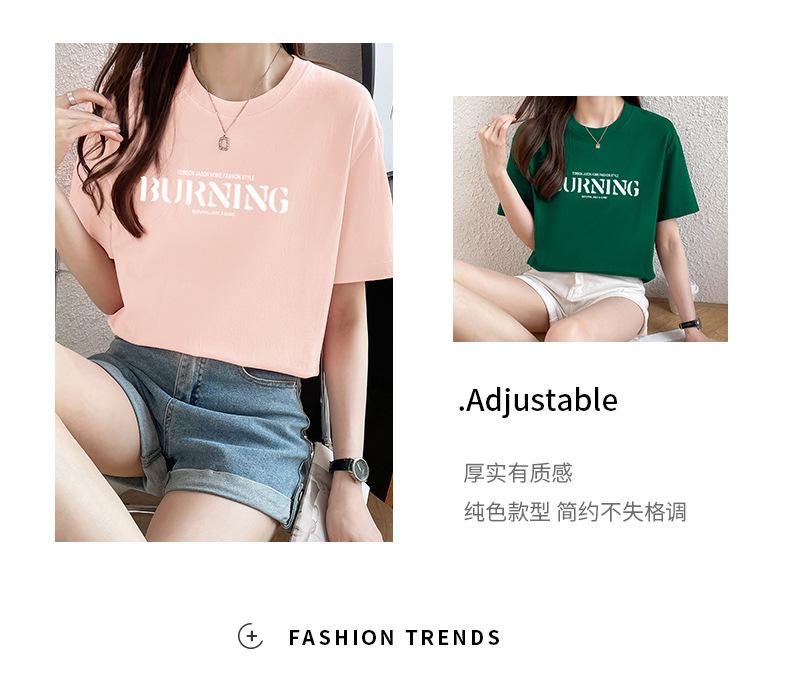 Camiseta de manga corta de algodón grueso de 260 g para mujer, diseño de cuello redondo, camiseta holgada con estampado de nicho y media manga.