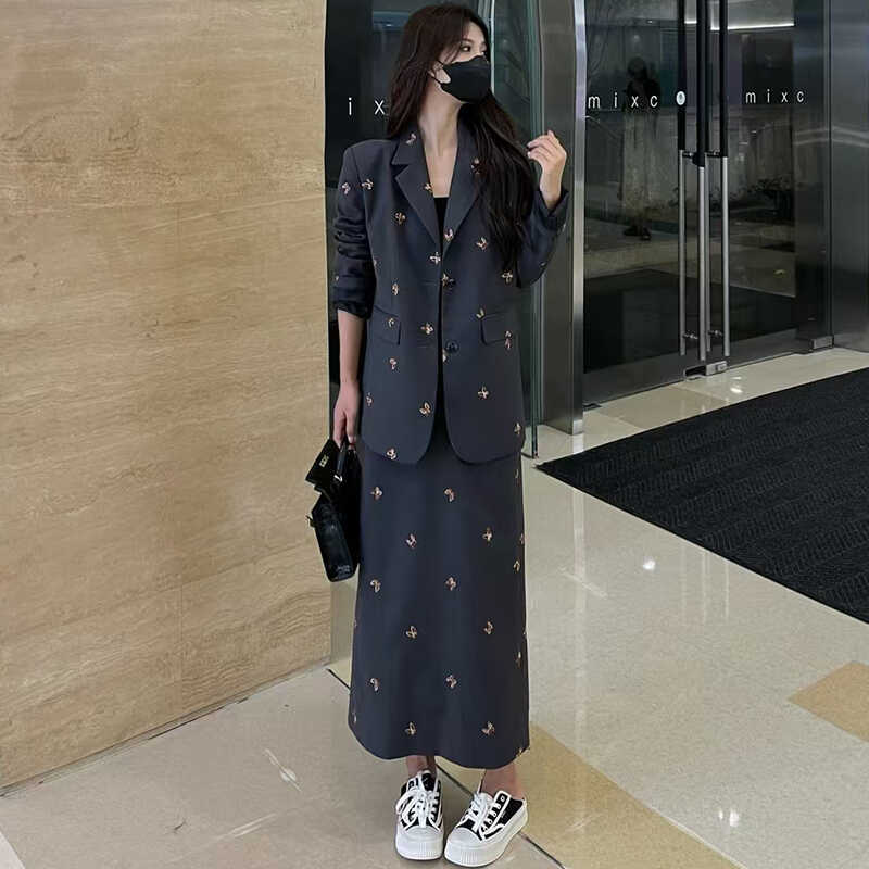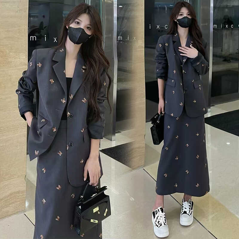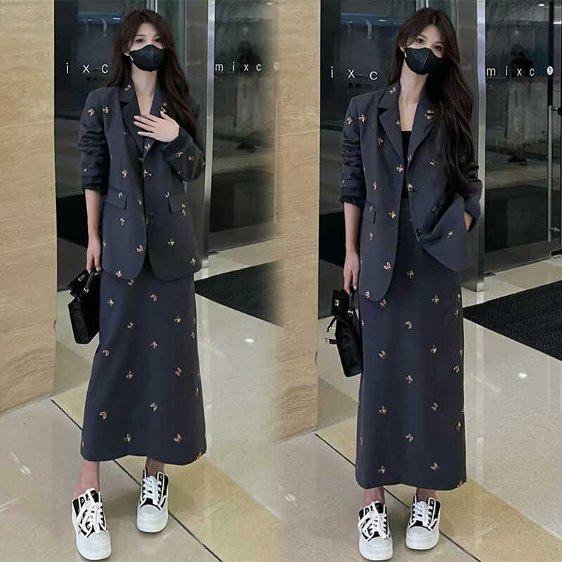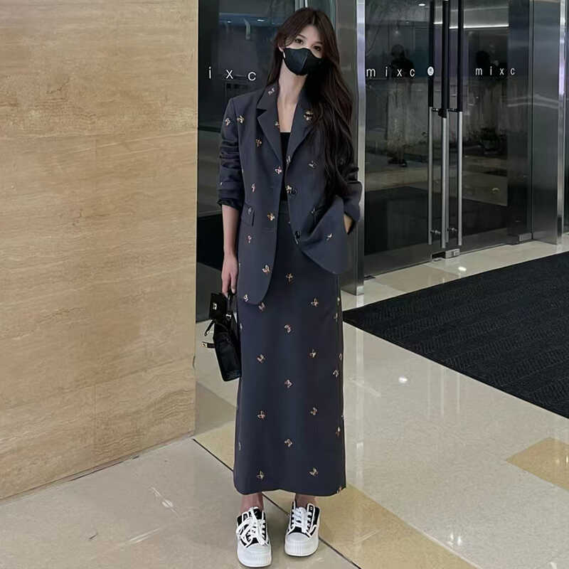 Falda de Traje de Moda para Mujer 2025 Primavera y Otoño Nuevo Estilo Chaqueta de Traje Bordada Falda de Cintura Alta Conjunto de Dos Piezas