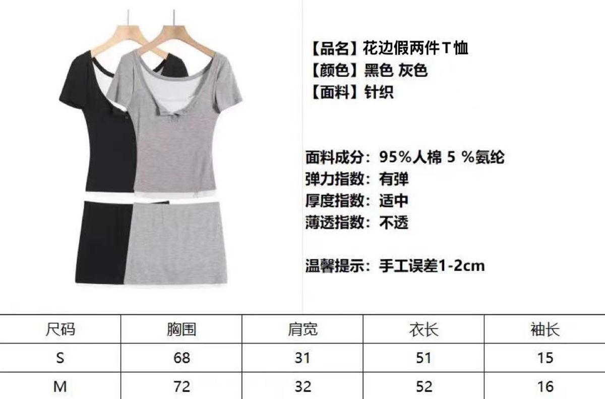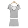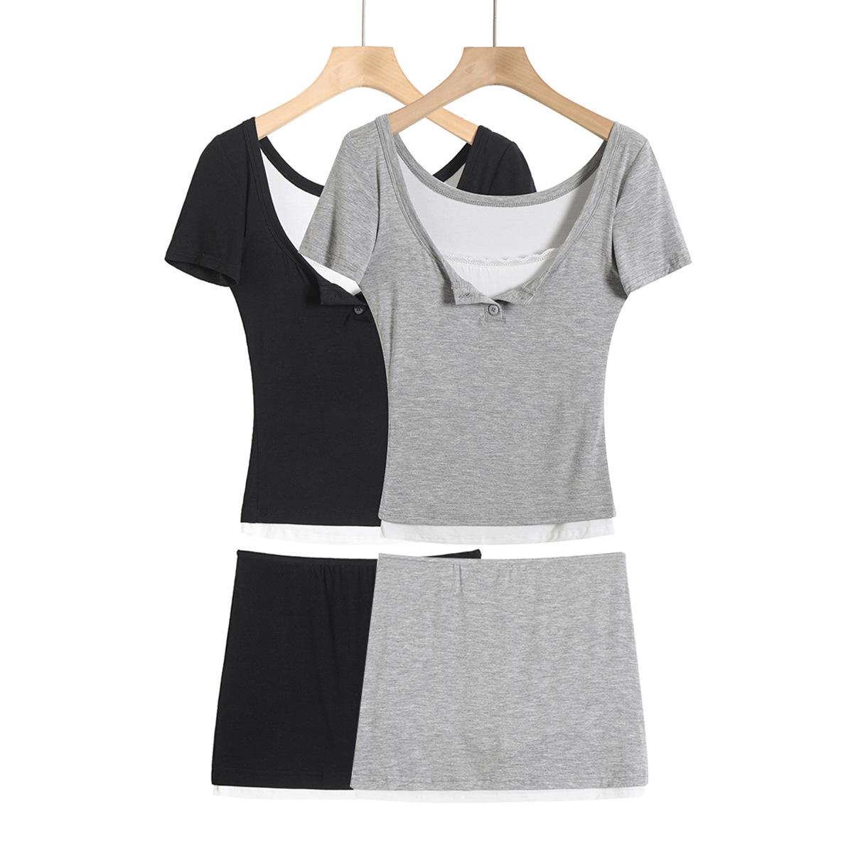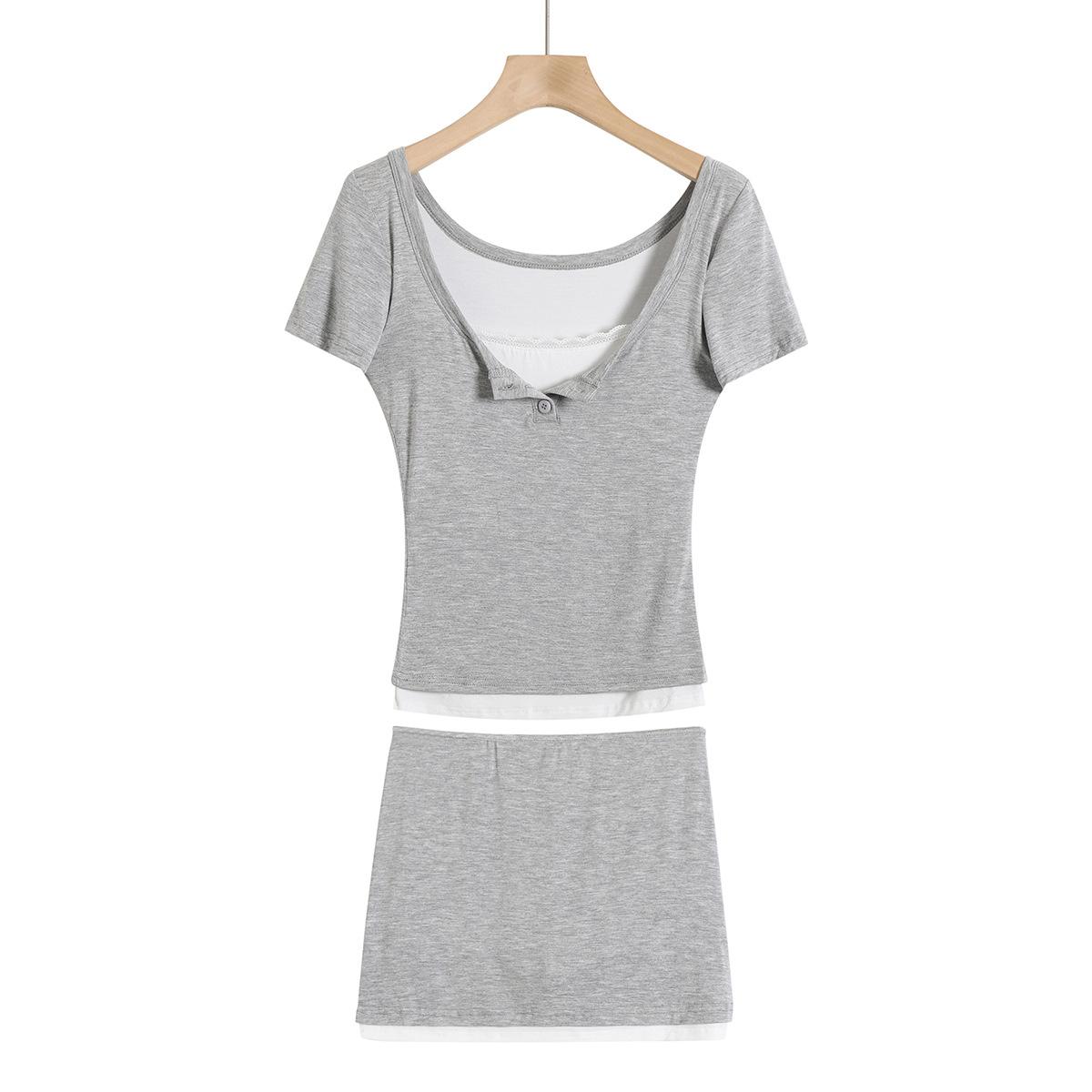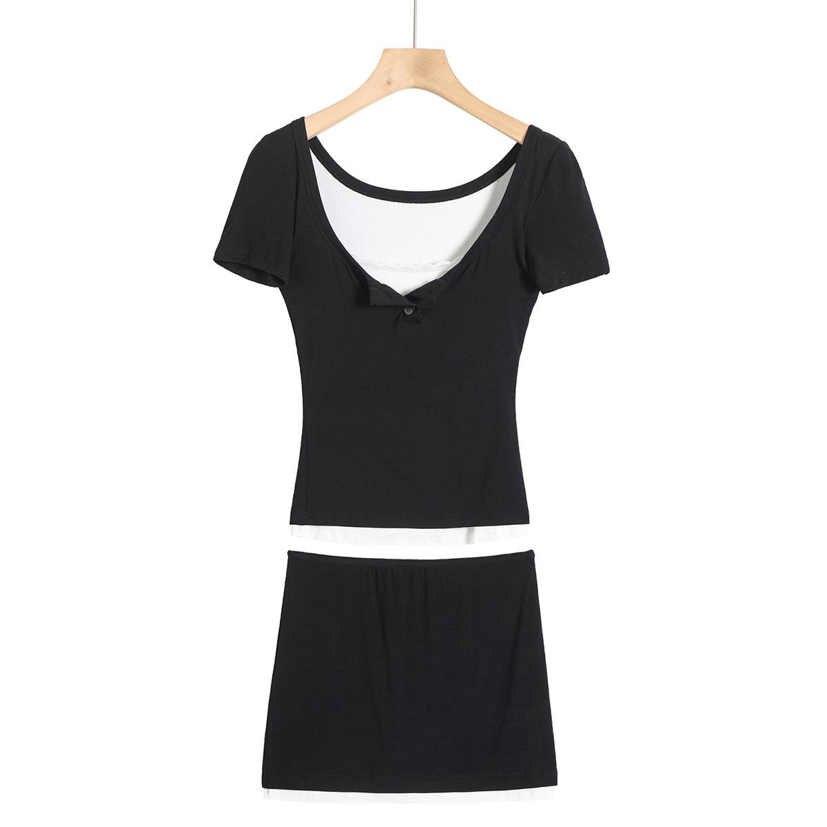 Conjunto de dos piezas formado por camiseta de manga corta y escote en V, estilo chica sexy, falda básica de corte A y longitud hasta la mitad.