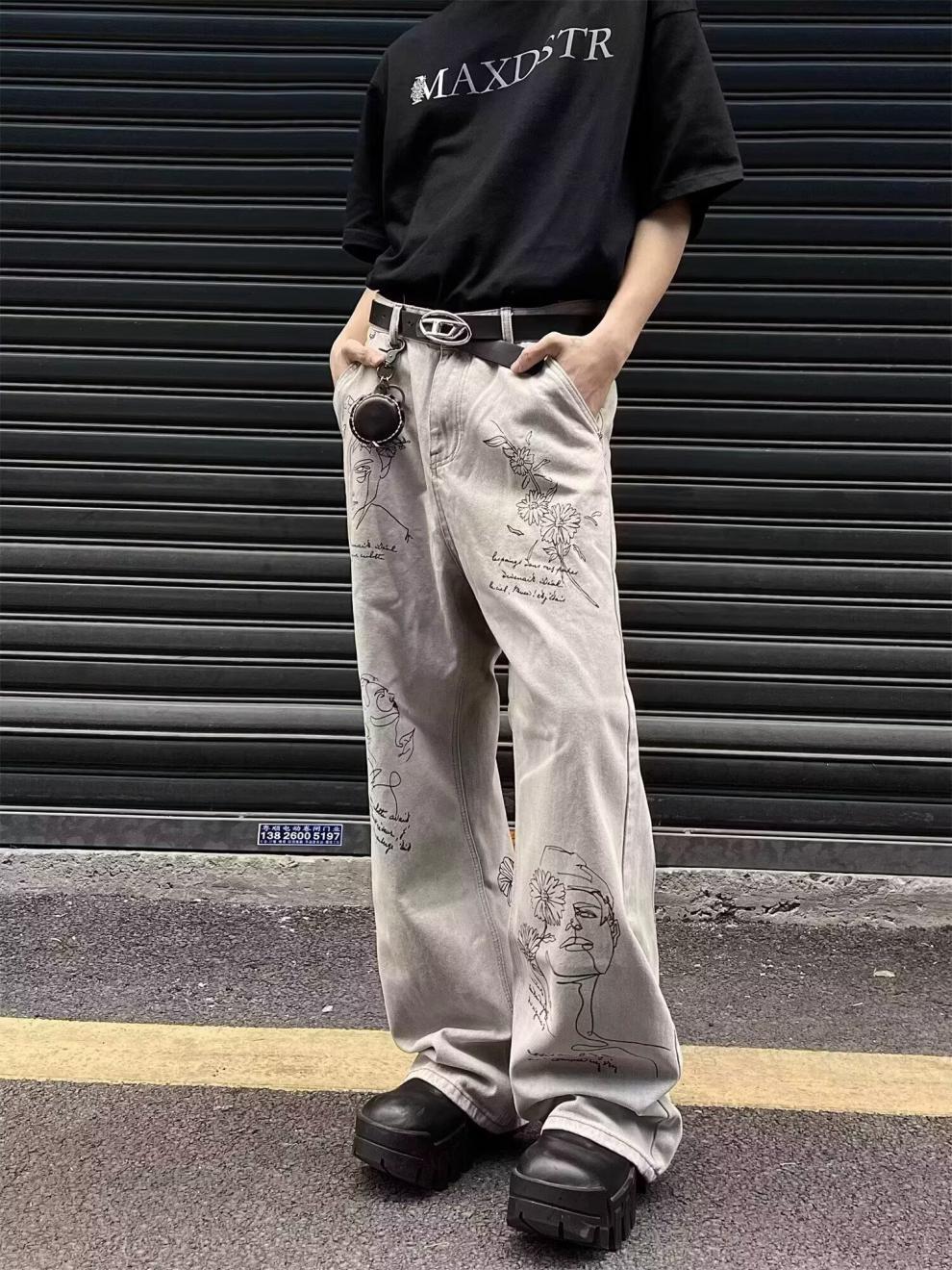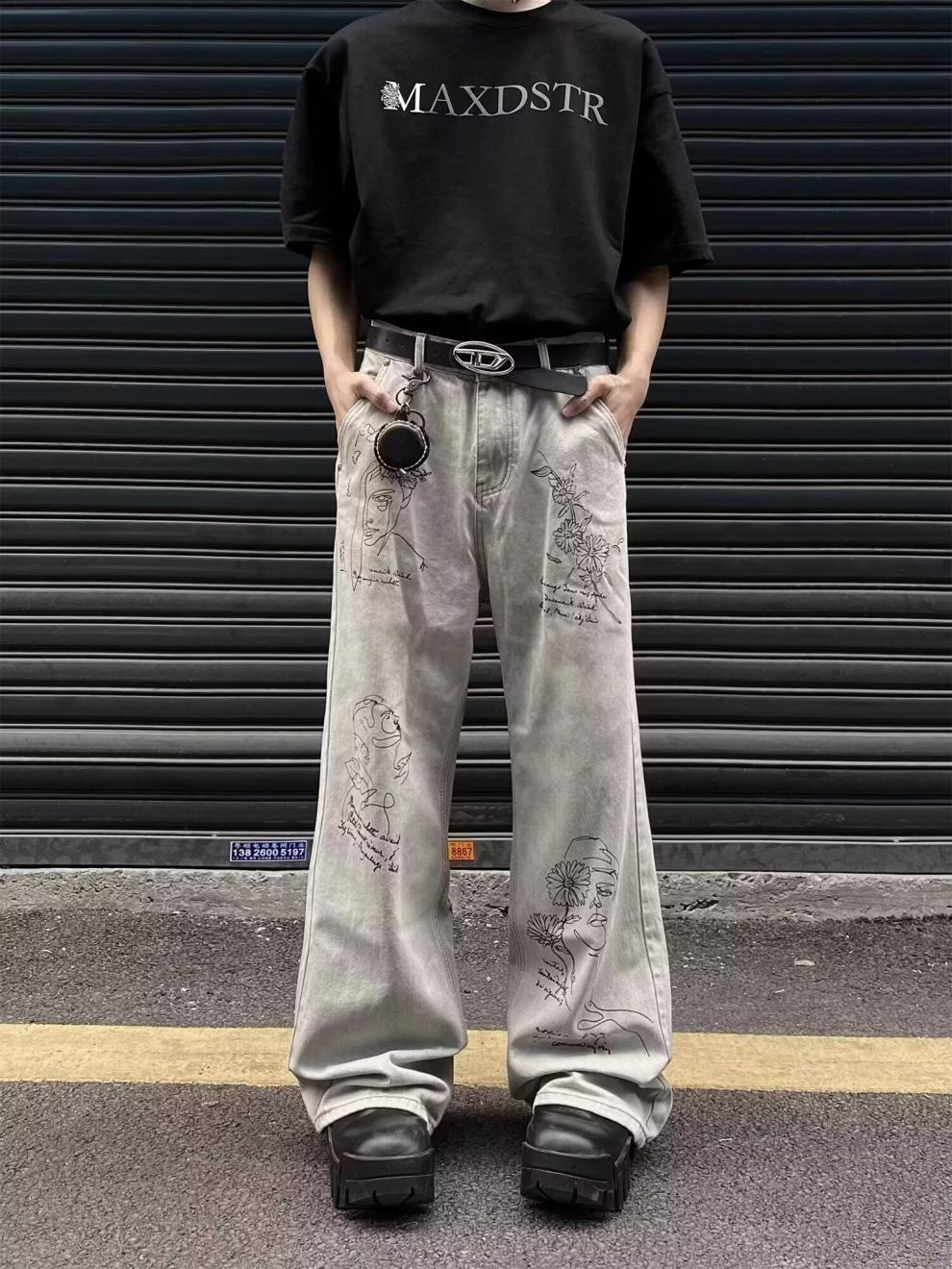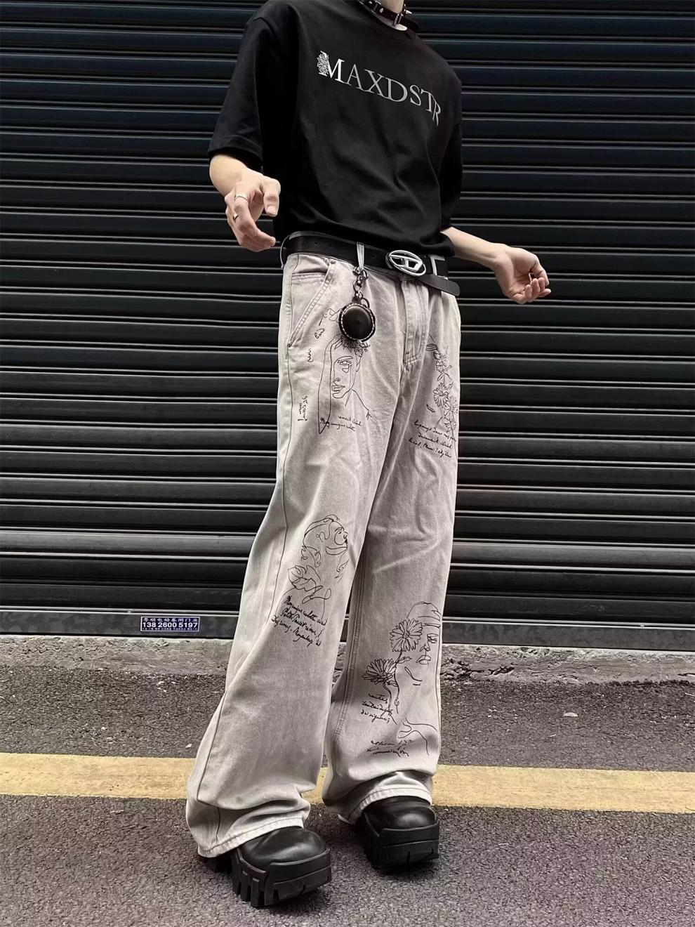 Pantalones vaqueros grises estilo americano de calle alta con estampado de grafiti de dibujos animados a la moda, pantalones anchos de pierna recta de gran tamaño