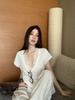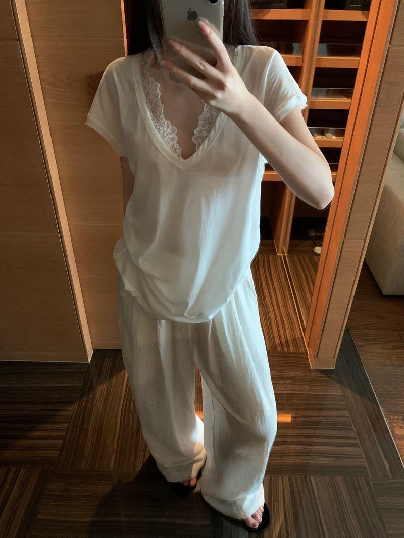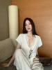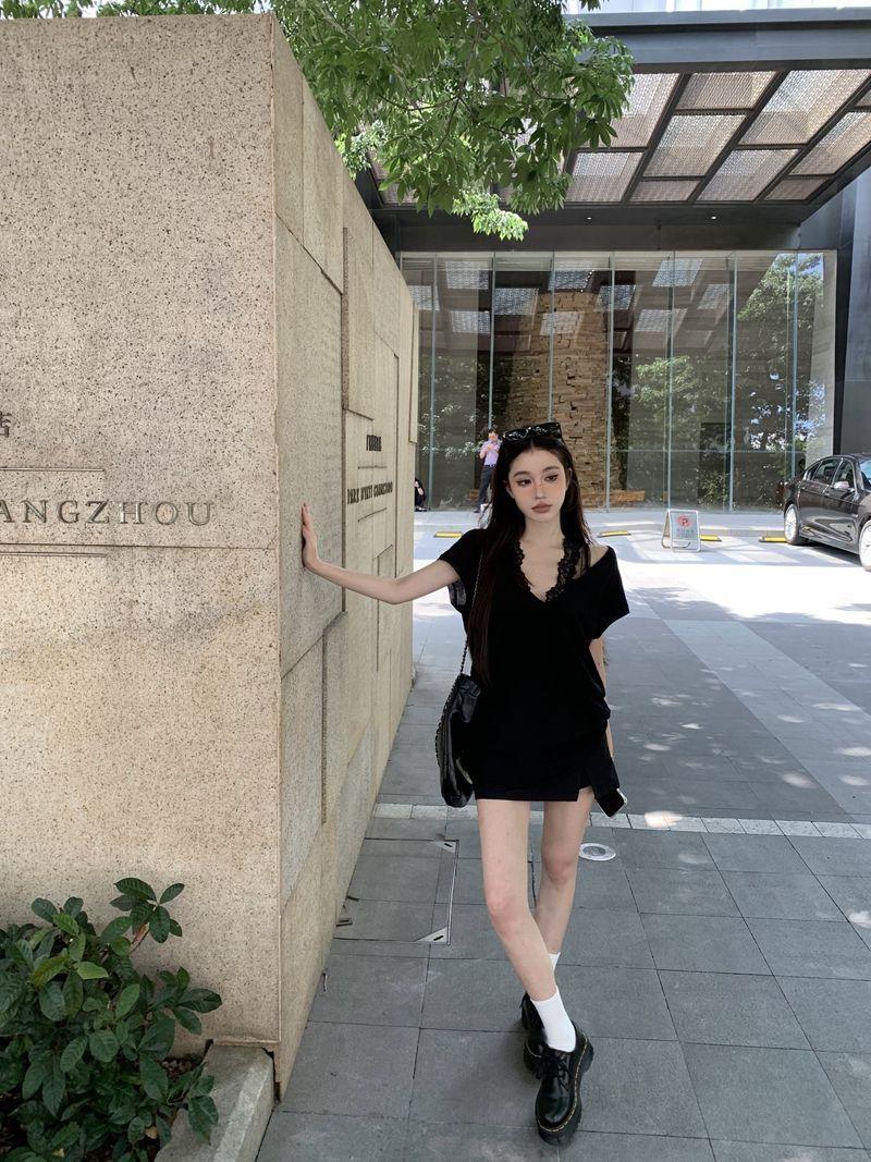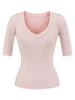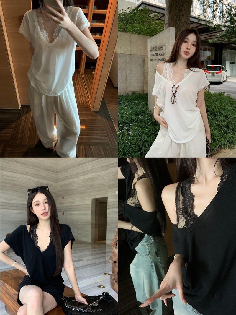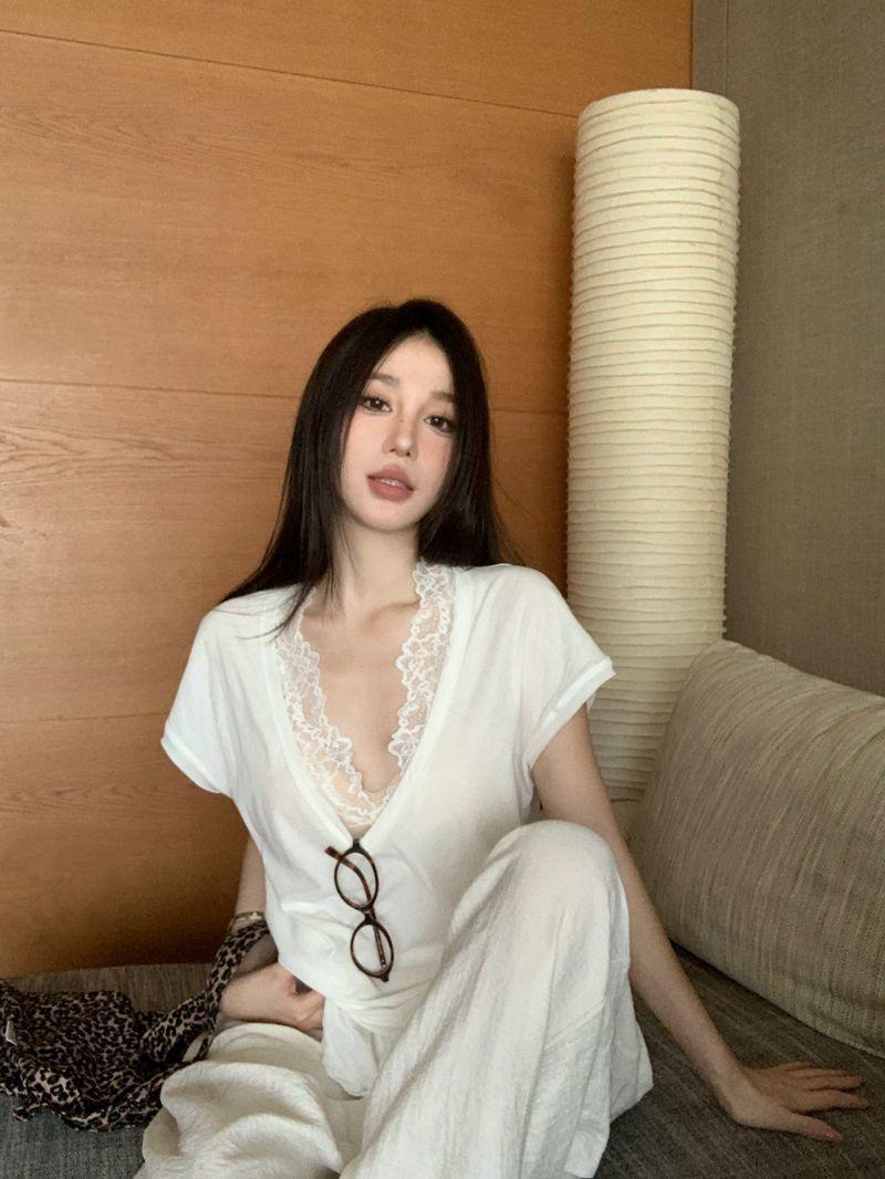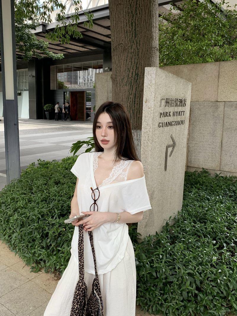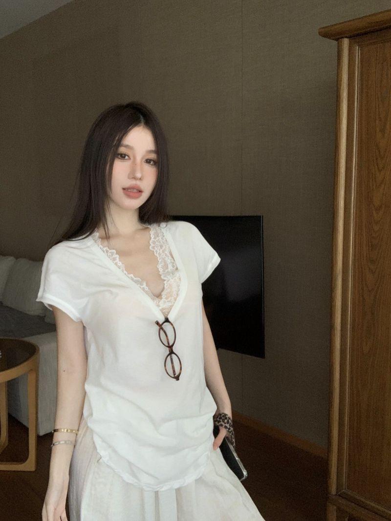 Camiseta blanca fina de manga corta con escote en V profundo para mujer, de verano, ajustada, adelgazante, sexy, de largo medio, estilo Spice Girls, top Niche que combina con todo.