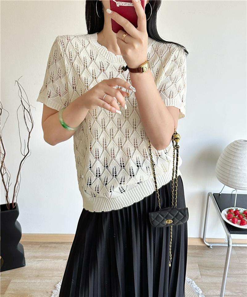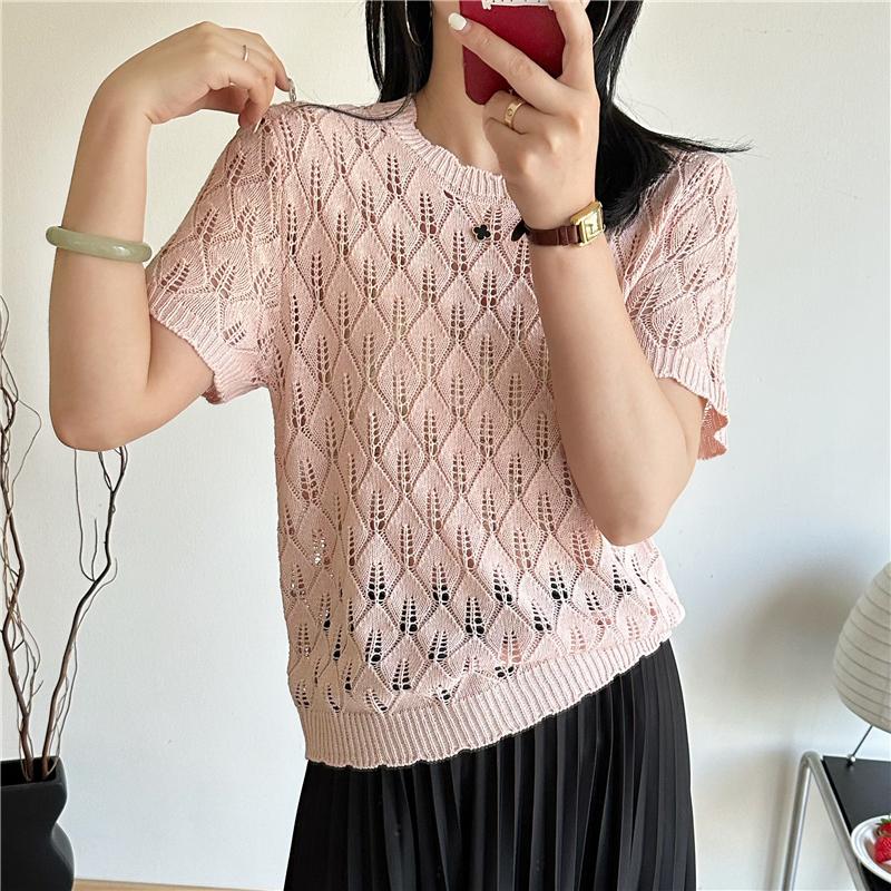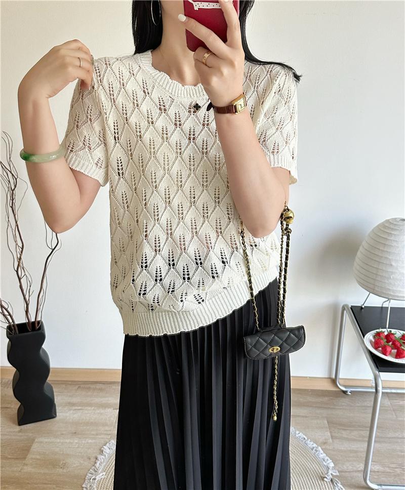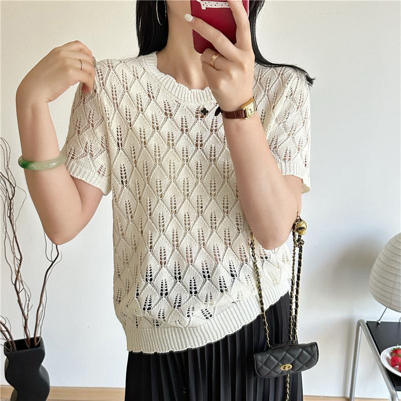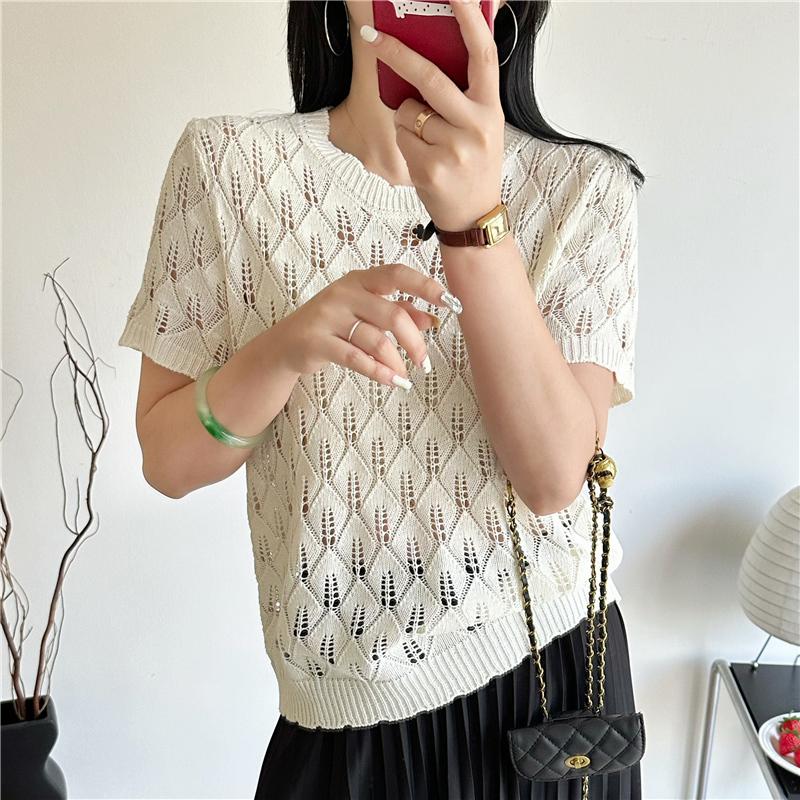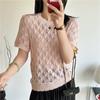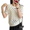 Camiseta holgada de manga corta para mujer, nueva camiseta de verano con cuello de loto, transpirable y hueca, de punto, de media manga, fina