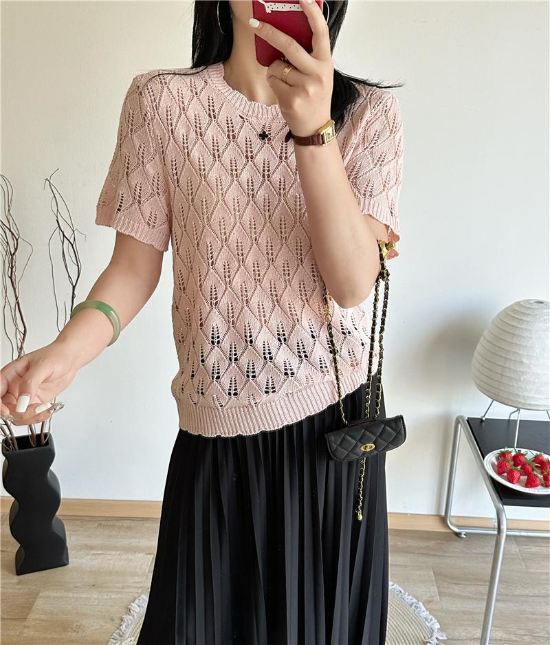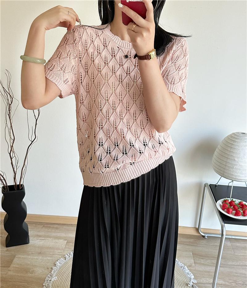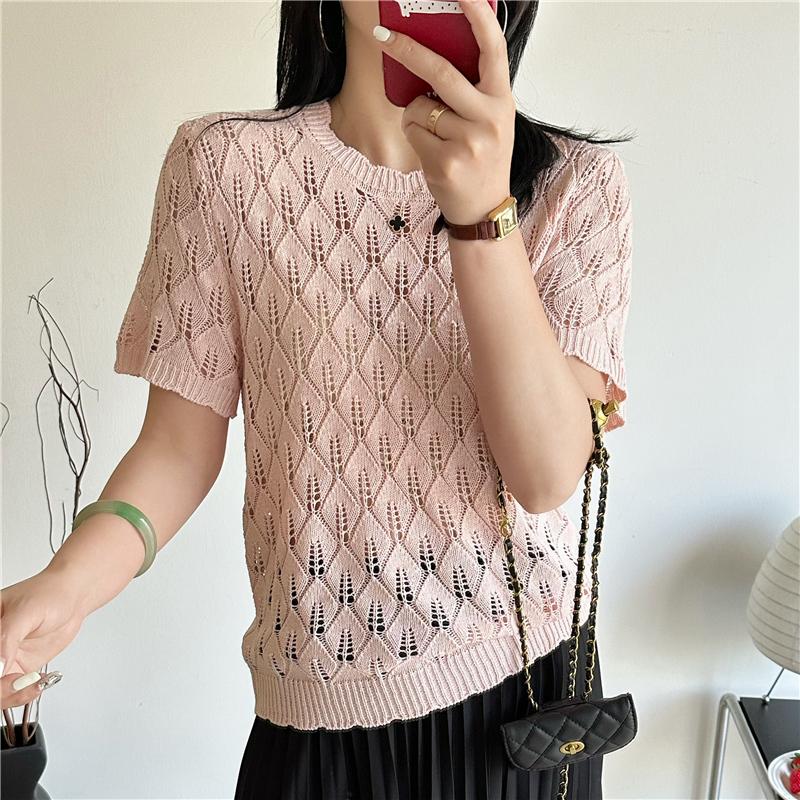 Compra Camiseta holgada de manga corta para mujer, nueva camiseta de verano con cuello de loto, transpirable y hueca, de punto, de media manga, fina al por mayor en Joom.pro