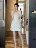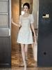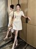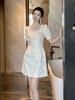 Ropa de mujer nueva de verano 2025 diseño francés cuello cuadrado cintura satén jacquard albaricoque vestido manga corta 9881