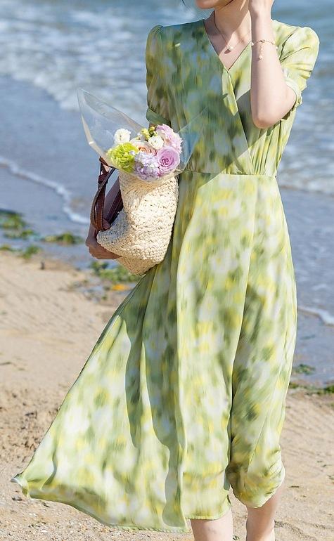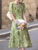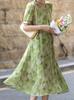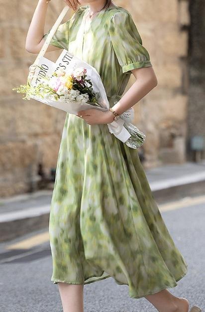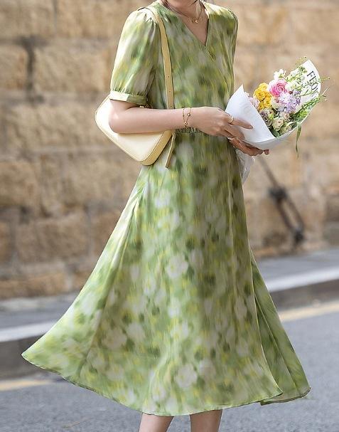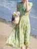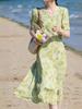 Vestido de verano 2024 con escote en V, estampado de gasa, falda plisada y cintura alta para mujer, largo medio