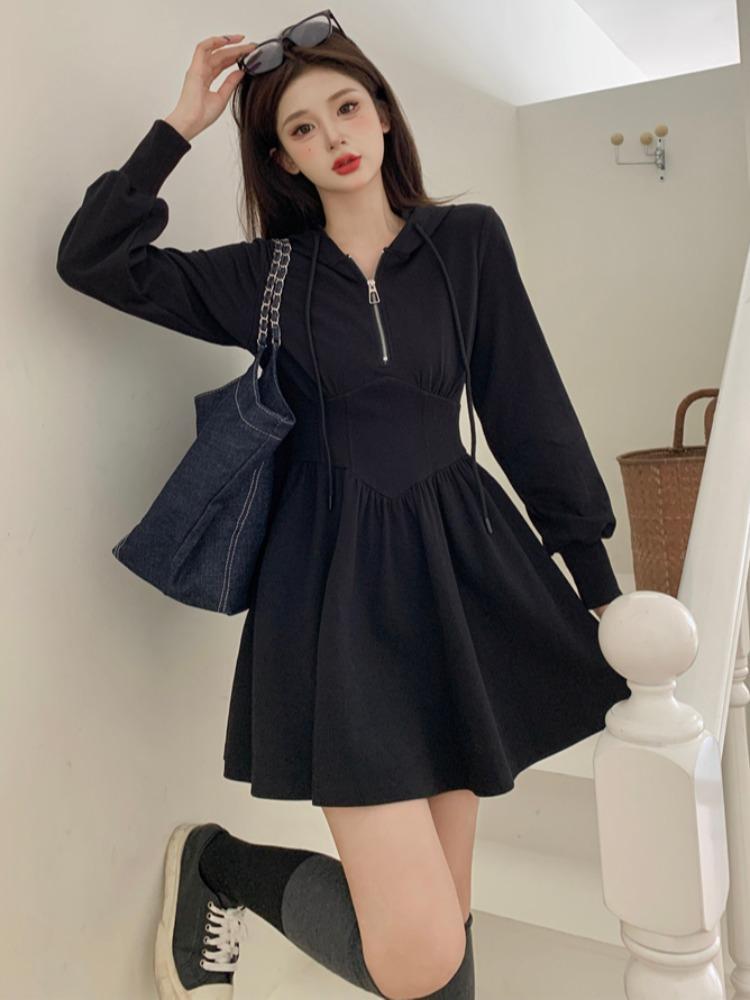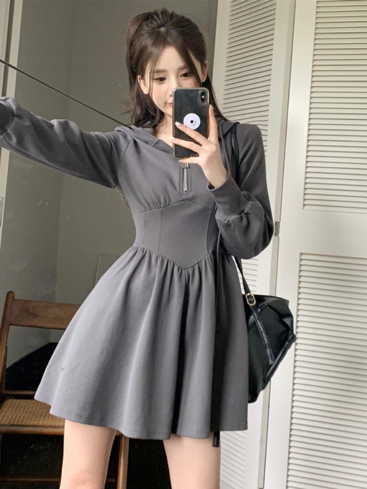 Compra Vestido de camiseta con capucha de manga larga para mujer, de talla grande, para principios de otoño, estilo coreano, a la moda, pequeño y fresco, con forma de A, falda corta al por mayor en Joom.pro