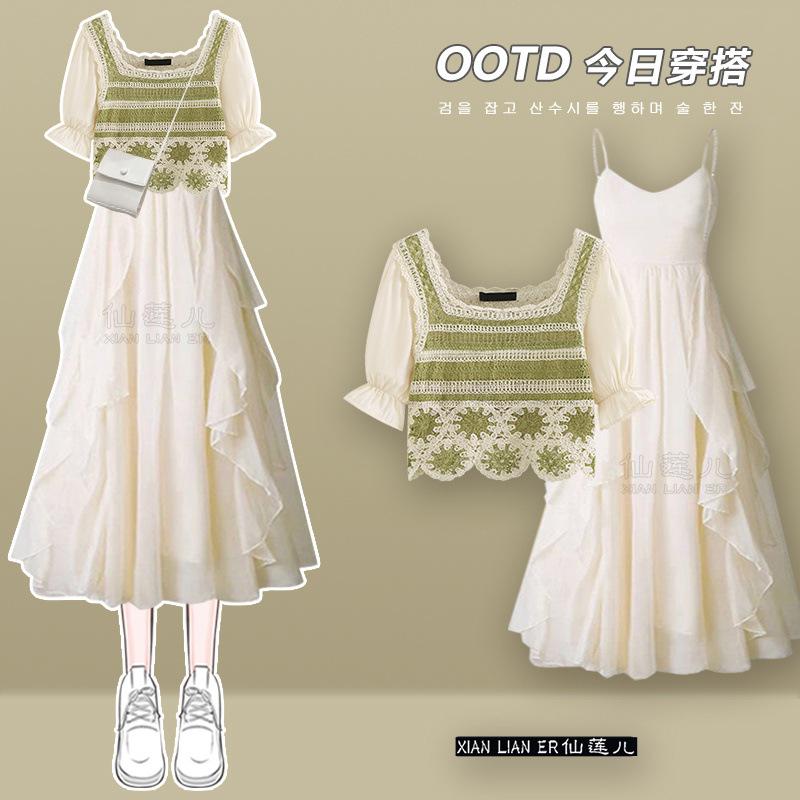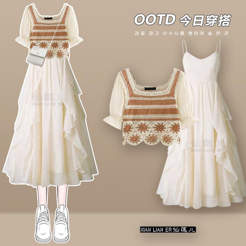 Dopamina de verano un conjunto de 2023 nueva moda reductor de edad chaqueta de manga corta vestido con tirantes conjunto de dos piezas