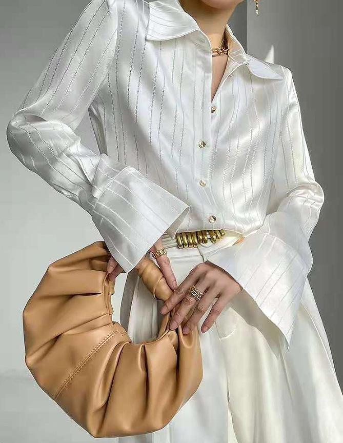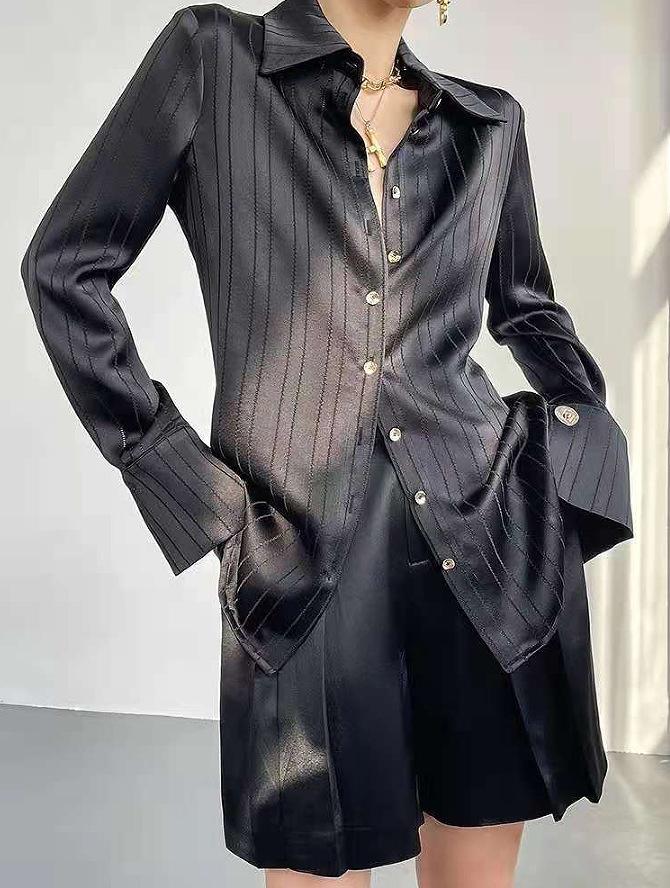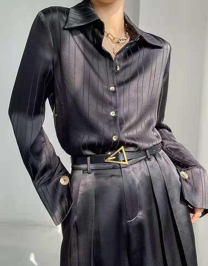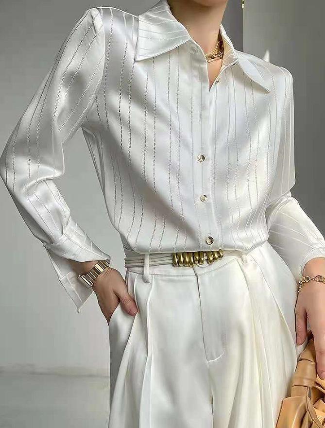 Camisa de satén de imitación acetato para mujer, estilo europeo, primavera y otoño, diseño nicho, informal, a rayas, sencilla, de manga larga.