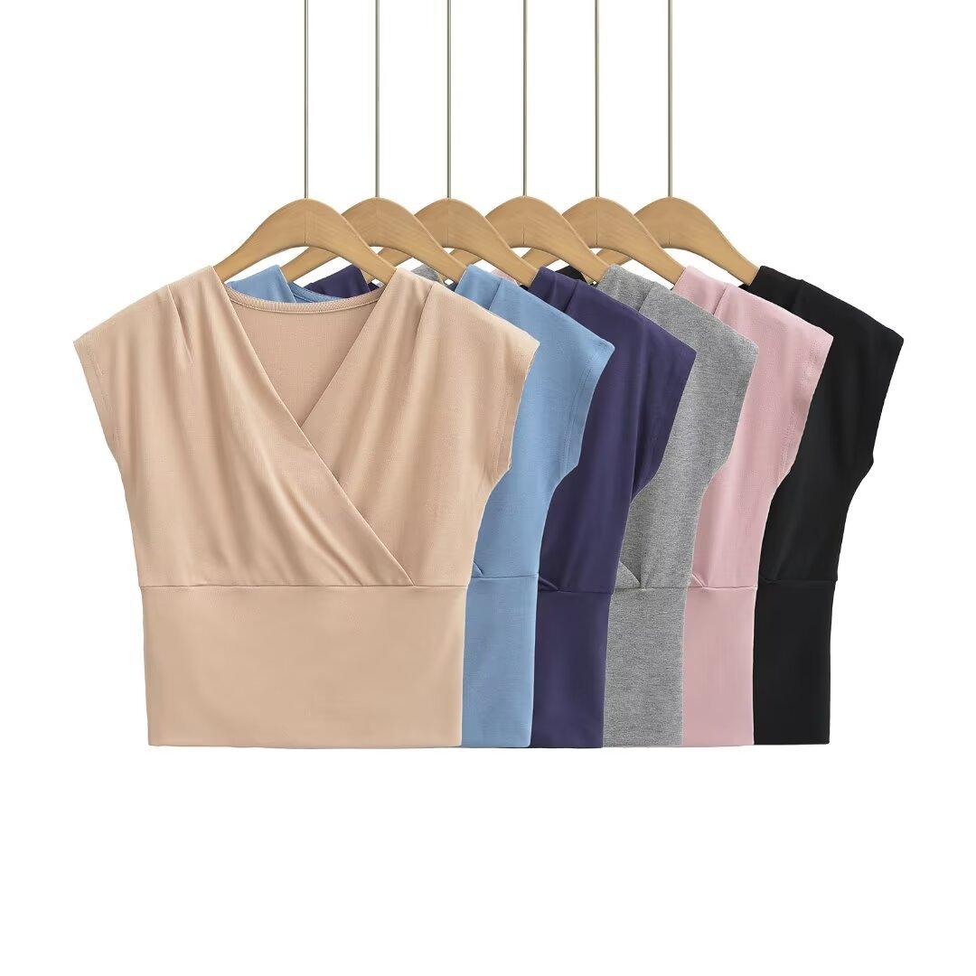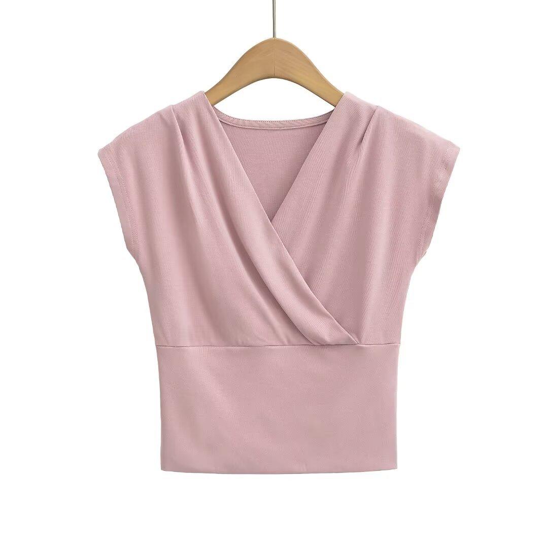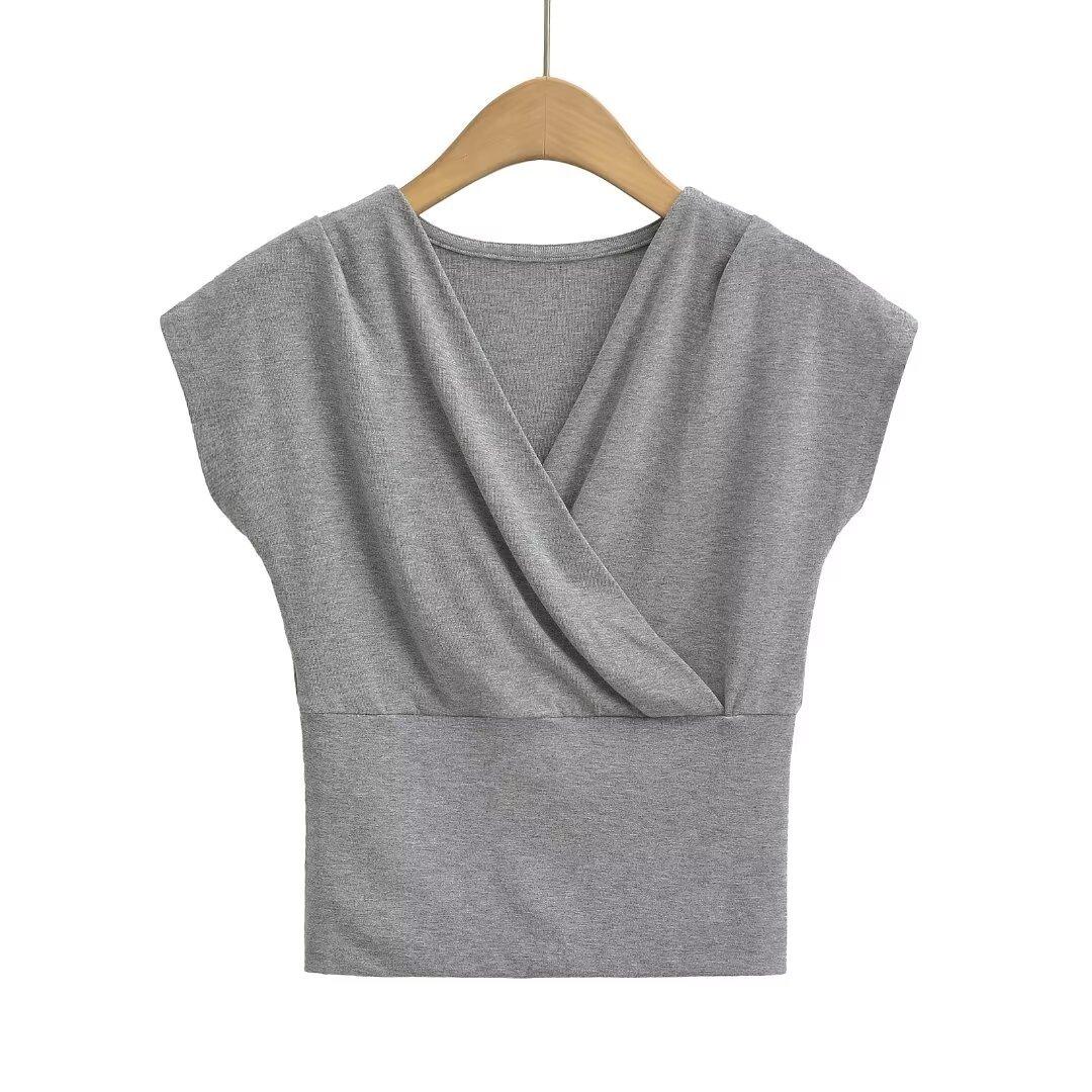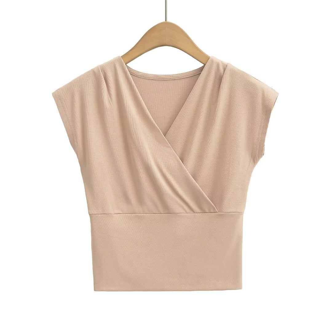 Camiseta ajustada con escote en V y cintura cruzada en el pecho para mujer, elegante y a la moda, combinable con todo, S20967