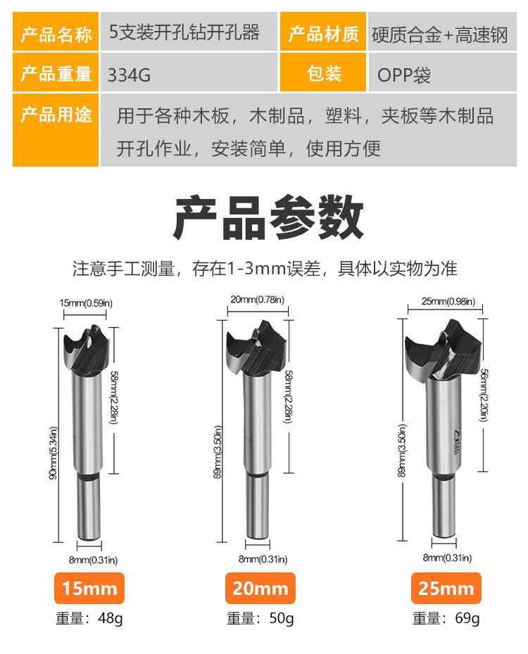 Brocas para agujeros, 5 piezas, abridor de agujeros para carpintería, herramienta para cortar madera, perforación de ala plana, placa de plástico, escariador, localizador de bisagras