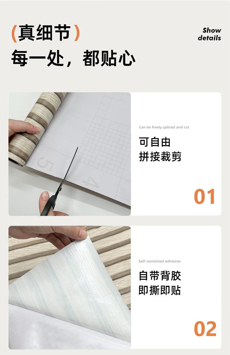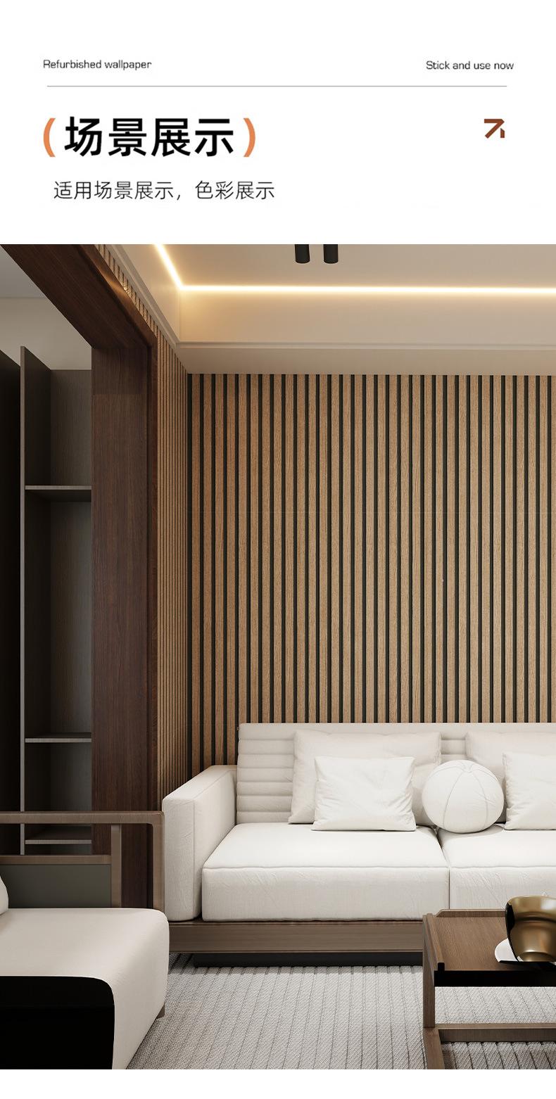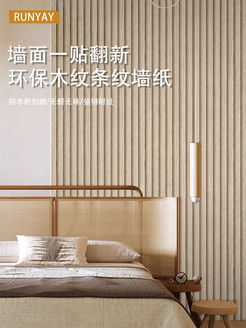 Papel tapiz autoadhesivo con rayas de madera y rejilla de imitación transfronteriza para dormitorio, pegatinas de pared autoadhesivas con vetas de madera de alto valor cromático.