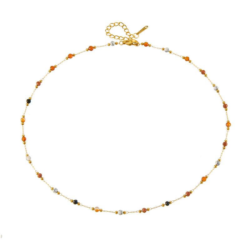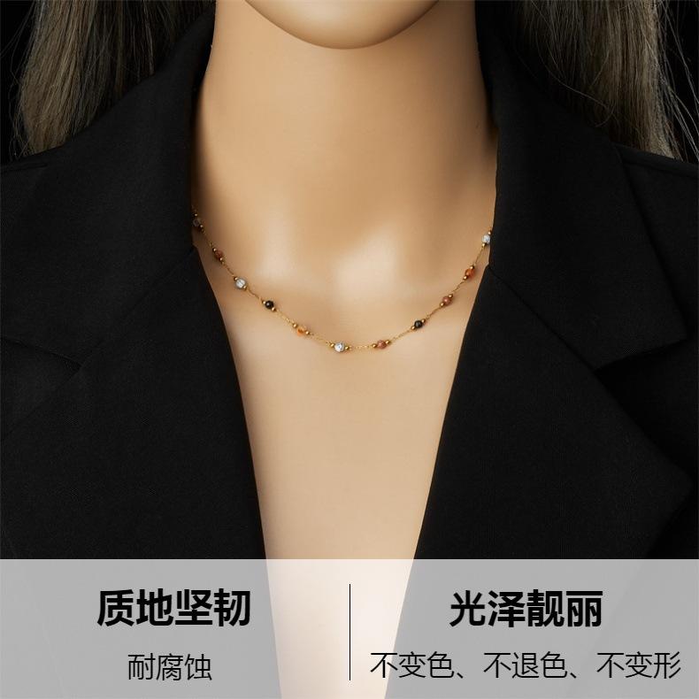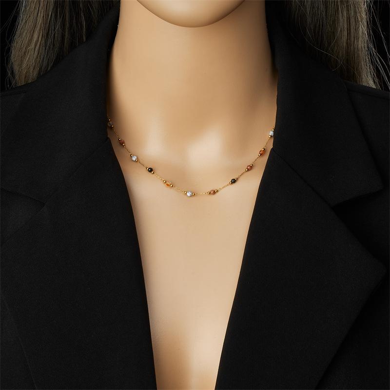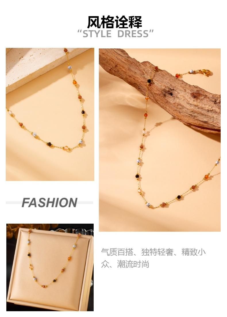 Collar de acero inoxidable chapado en oro con cadena de cuentas de piedra de color, diseño retro de nicho de moda europea y americana