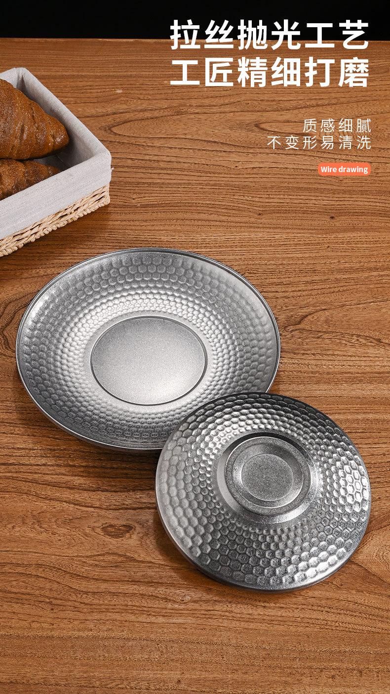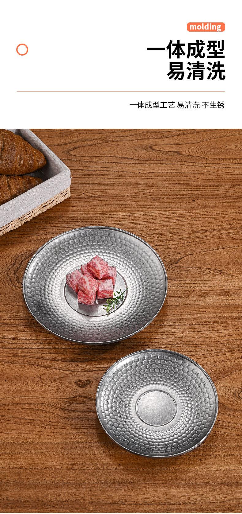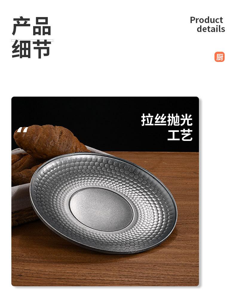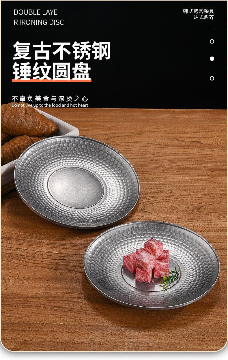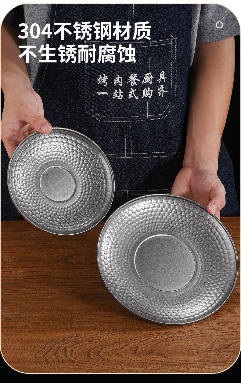 Logotipo de Fábrica Personalizado Retro Acero Inoxidable 304 Disco Plato Hondo Plato para Pastel de Postre Patrón Martillado Tienda Antigua de Barbacoa