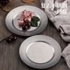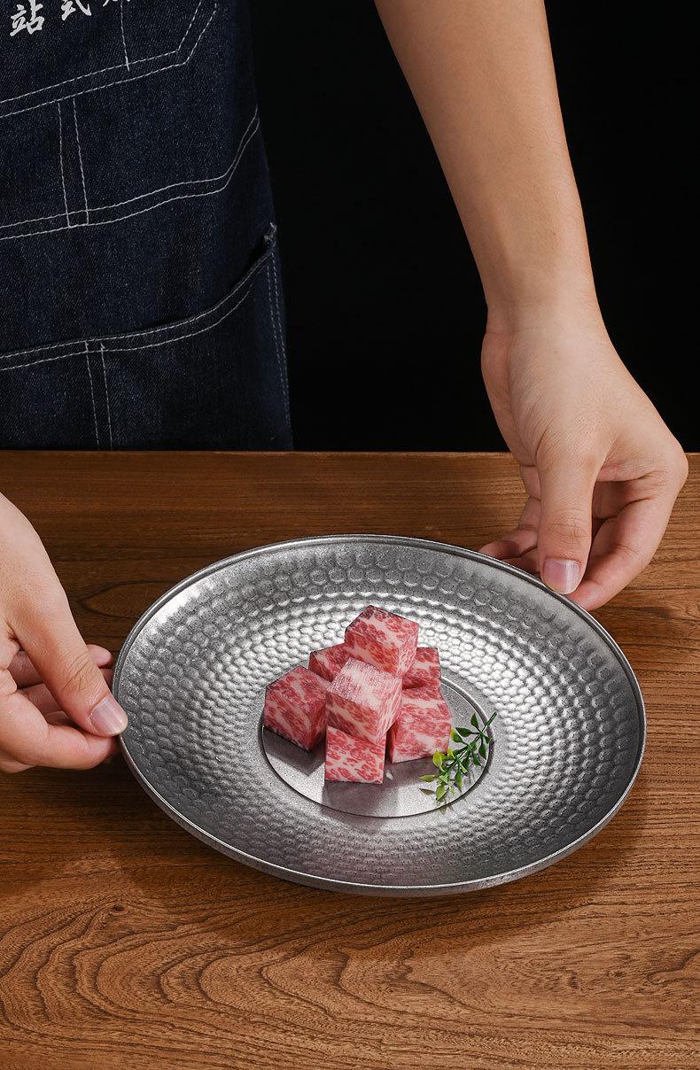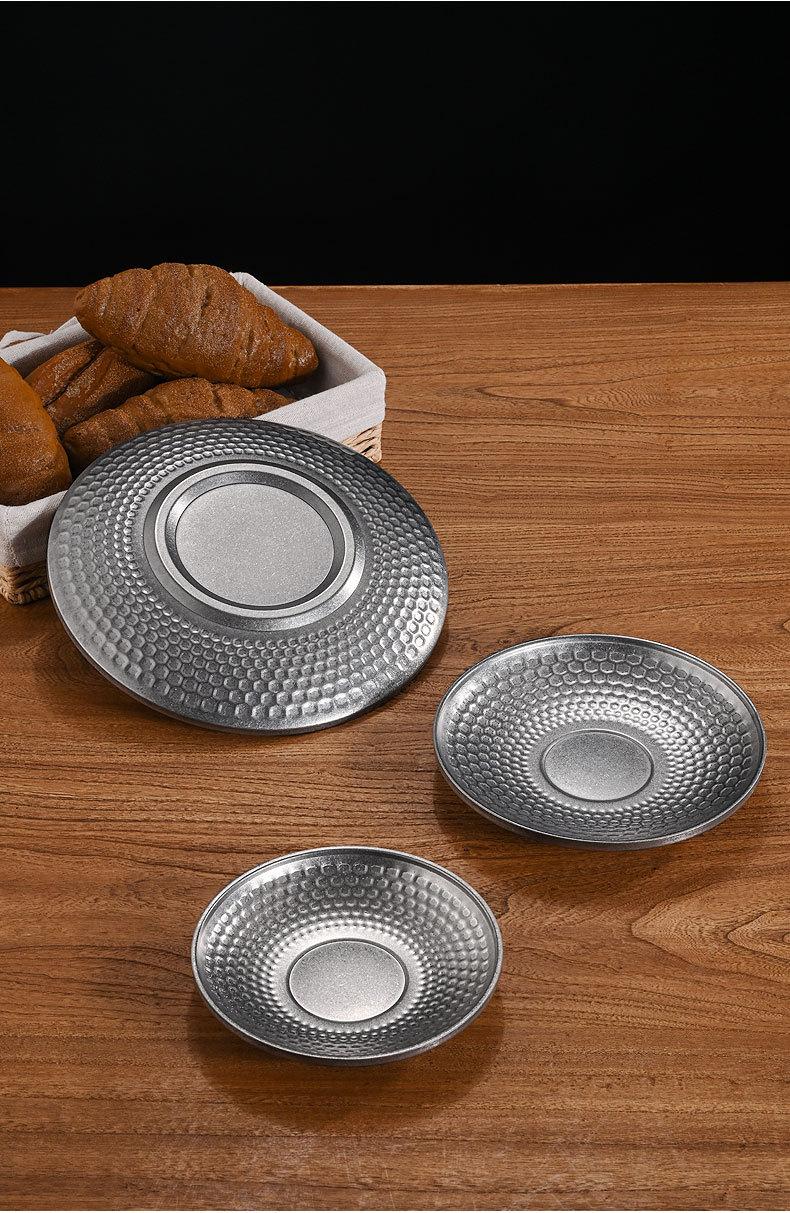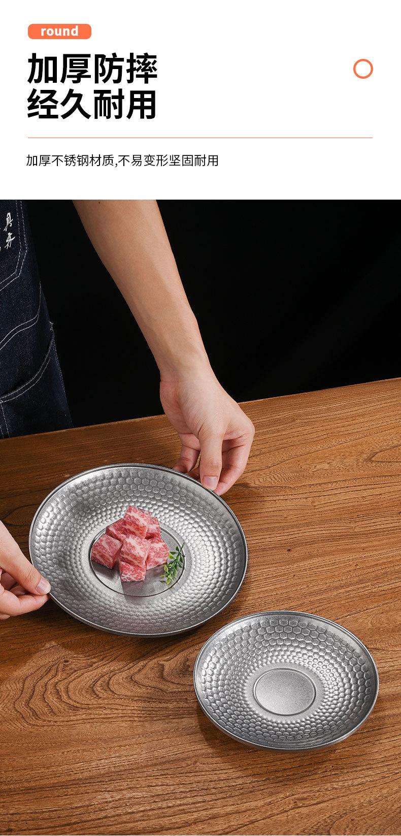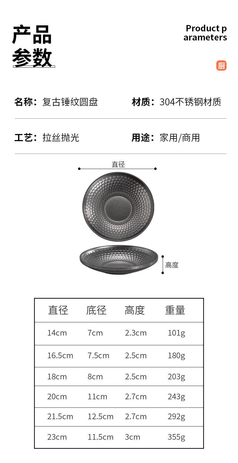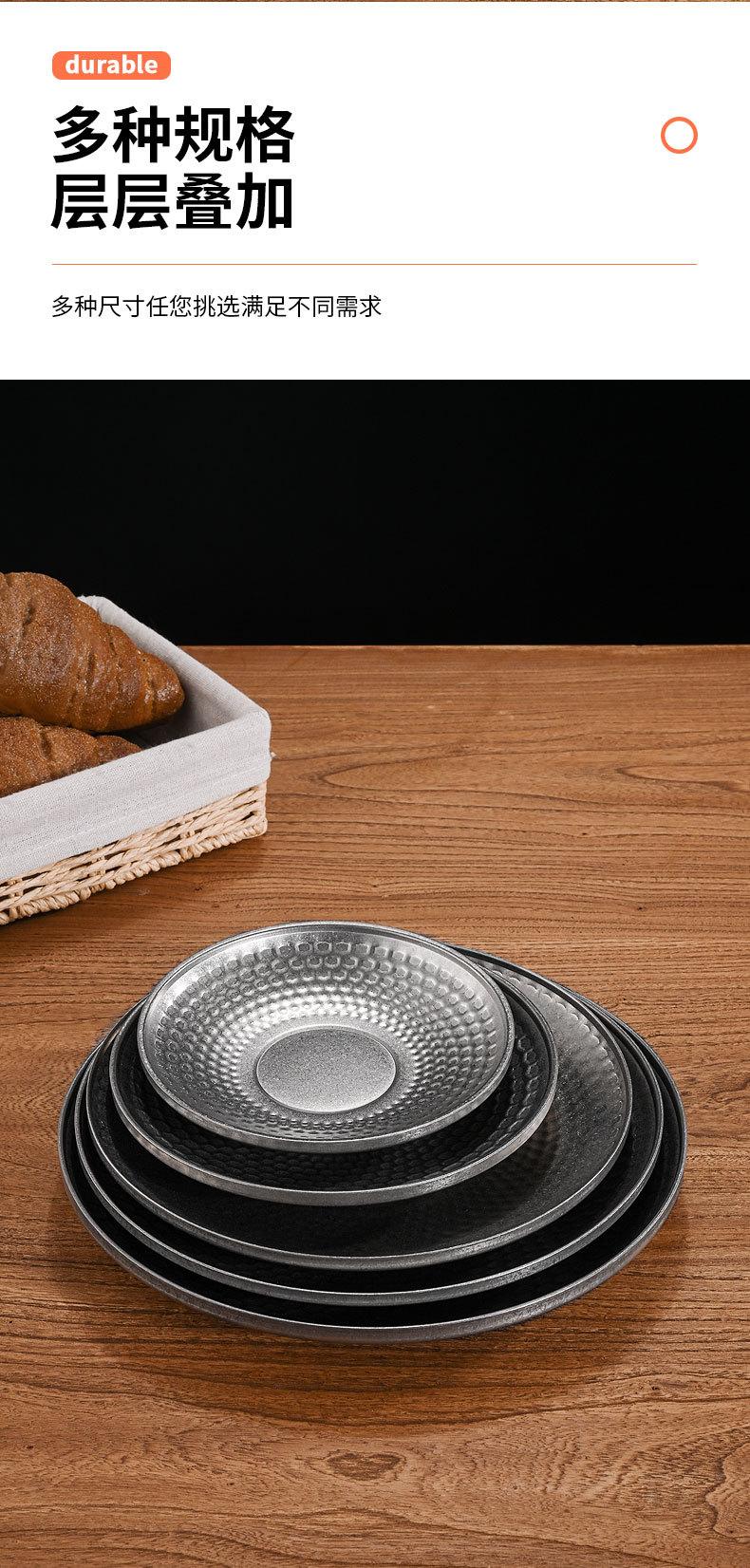Logotipo de Fábrica Personalizado Retro Acero Inoxidable 304 Disco Plato Hondo Plato para Pastel de Postre Patrón Martillado Tienda Antigua de Barbacoa