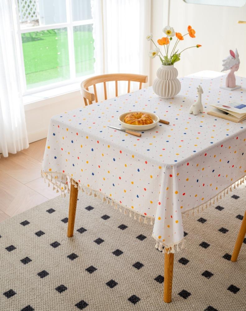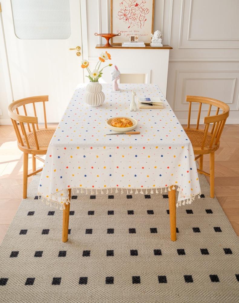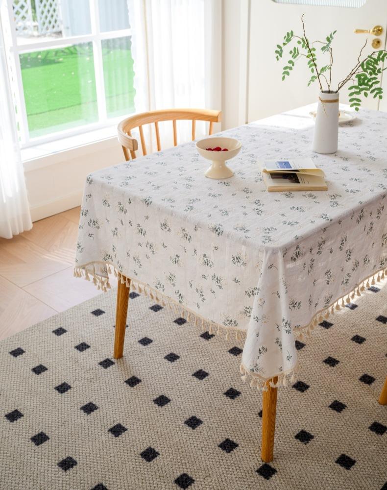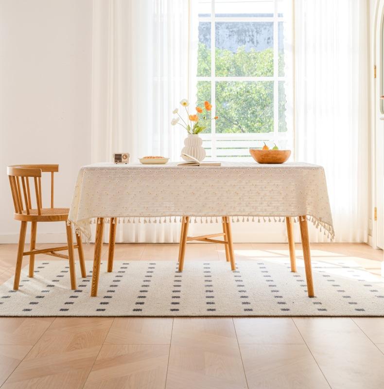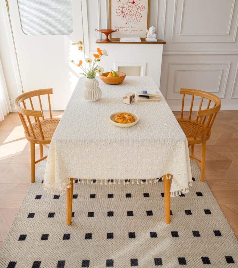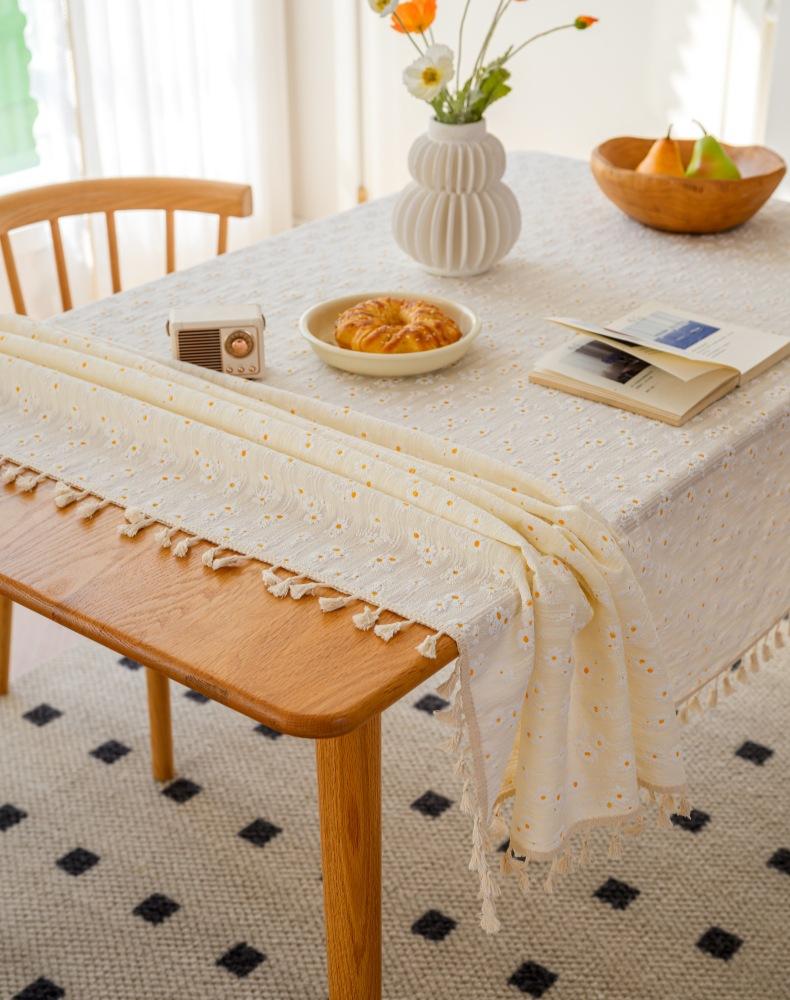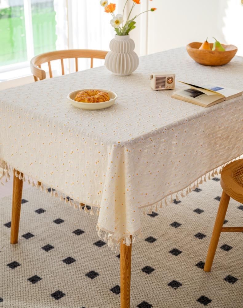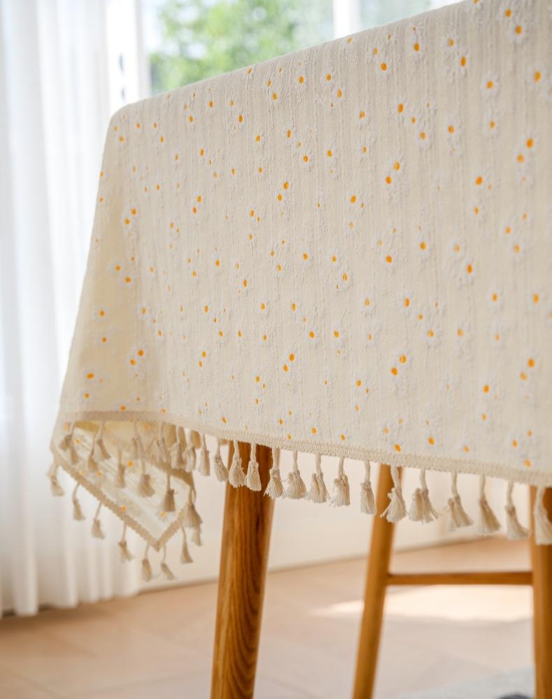 Mantel pequeño de algodón y lino fresco con borlas y flores de margaritas pequeñas, rectangular y sencillo.
