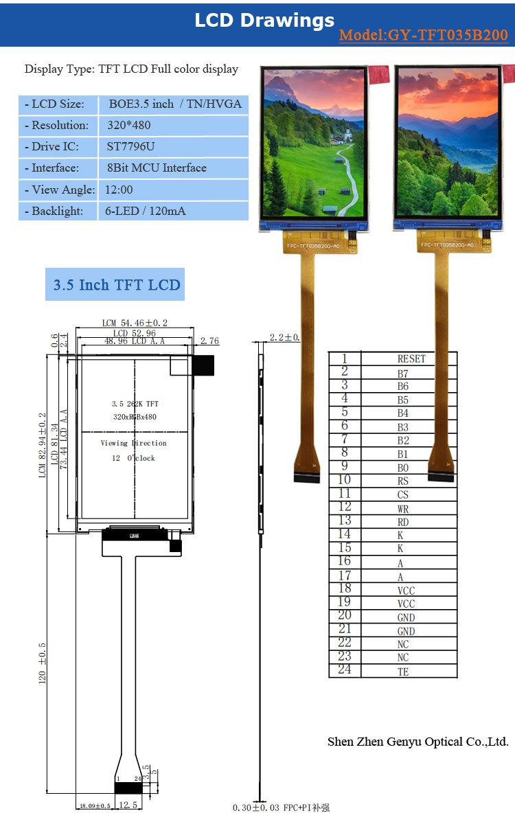 Fábrica de Shenzhen Pantalla a Color de 3.5 pulgadas Interfaz SPI 320*480 LCD Pantalla LCD ST7796U Pantalla de 24 pines