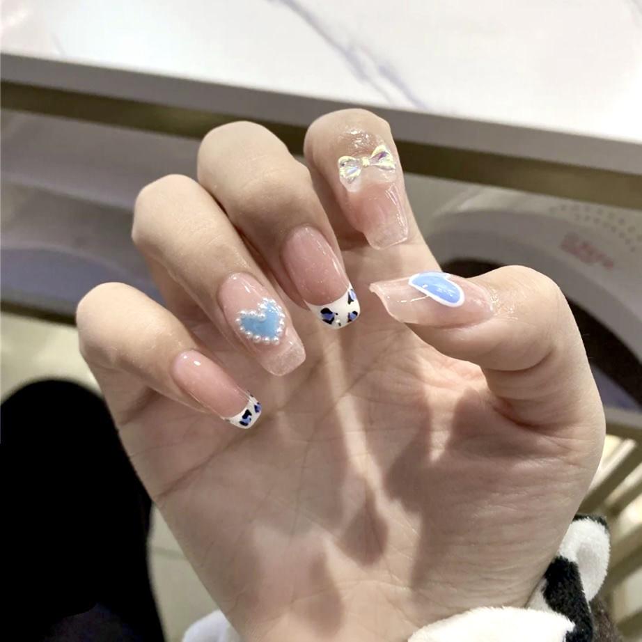 Pegatinas de uñas para usar, diseño de leopardo azul, perla, amor, pieza de uña, uña, parche de uña, uña postiza, pieza de uña terminada