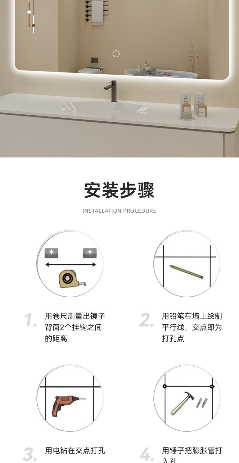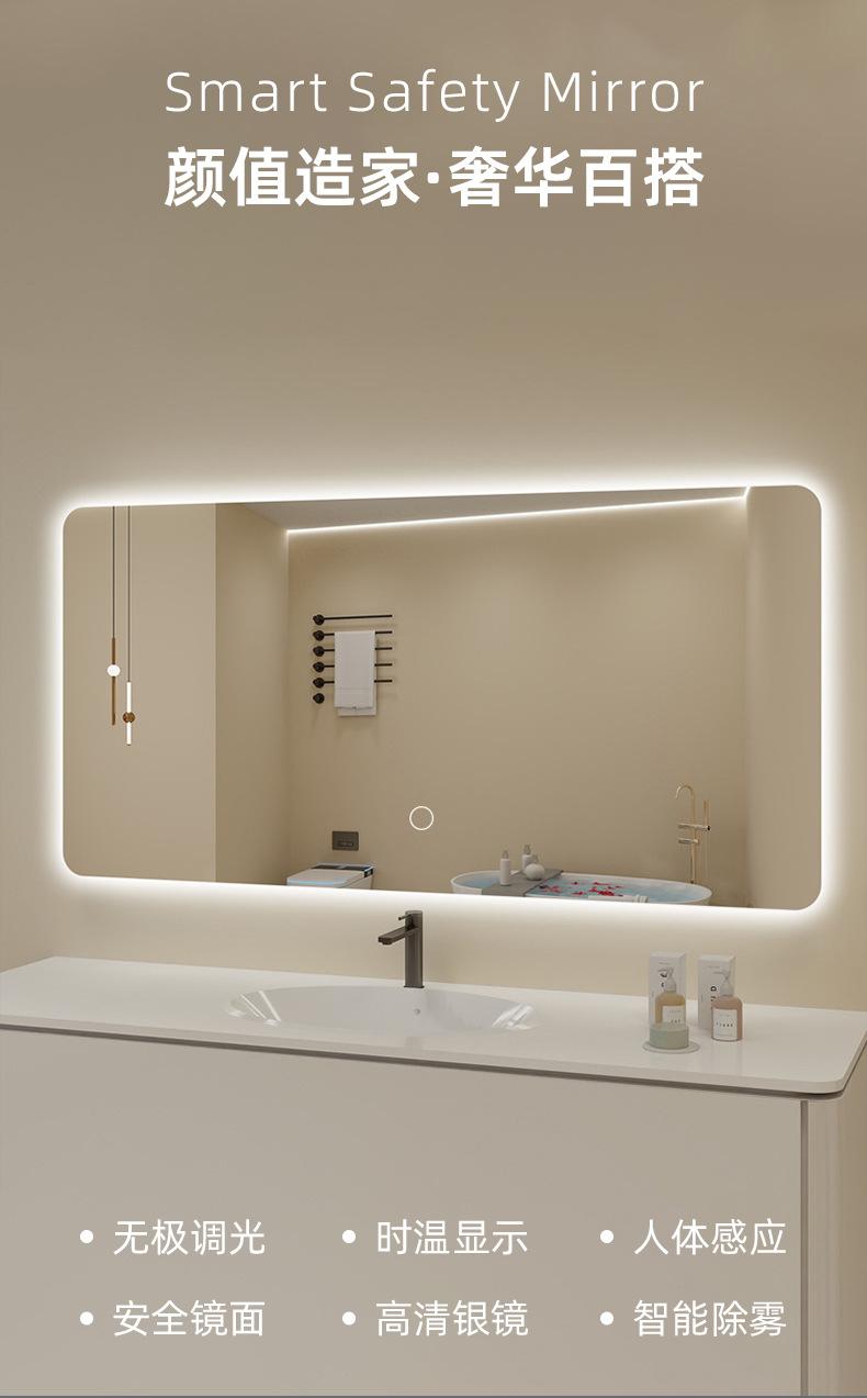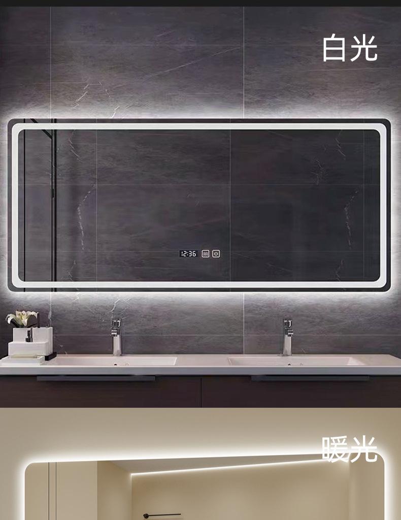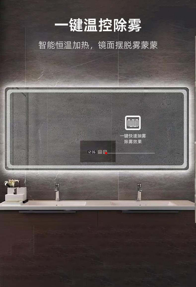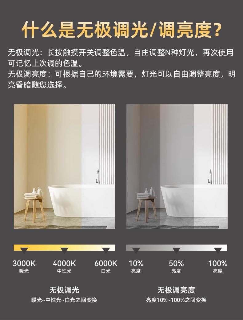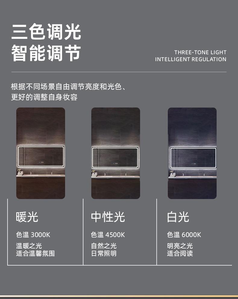 "three-color light + defogging + time and temperature display" dual touch keys + stepless dimming and color adjustment + defogging