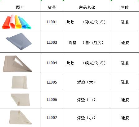 Ll001-grilling mat, Ll003-grilling mat, Ll004-grilling mat, Ll005-kneading pad, Ll006-flour mat, Ll007-baking mat