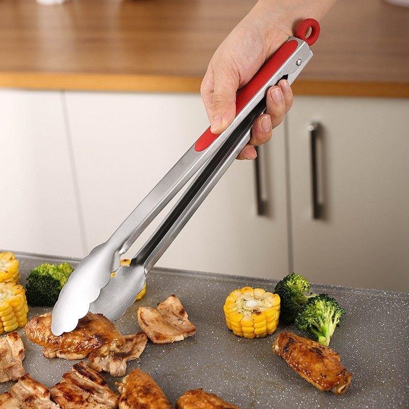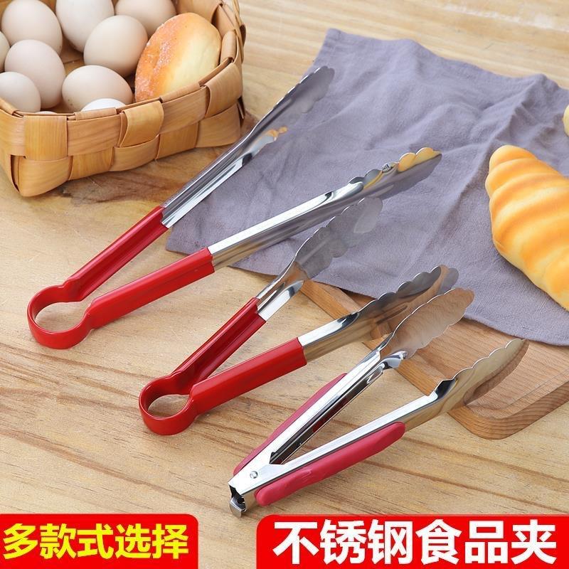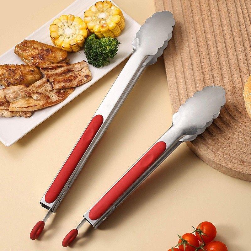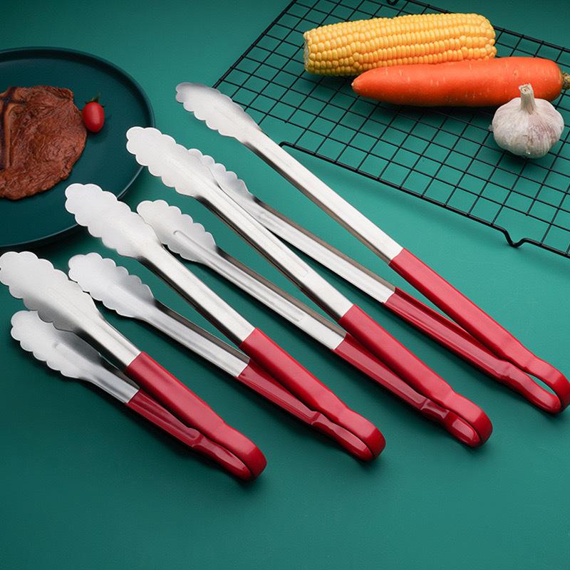 Pinza para alimentos de acero inoxidable con mango rojo, antiescaldaduras, pinza para pan, pinza para barbacoa, pinza para carne, pinza para verduras, pinza para barbacoa