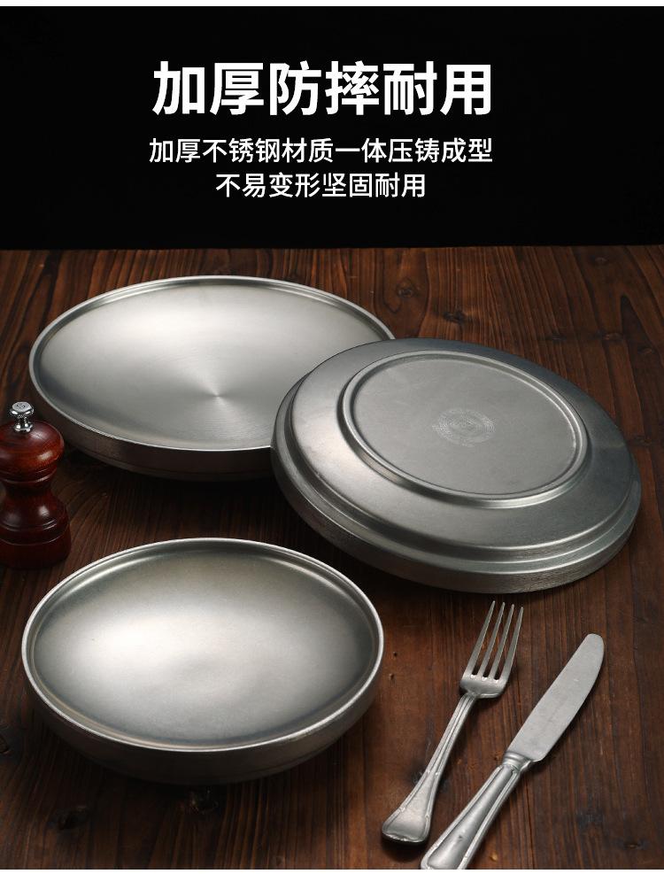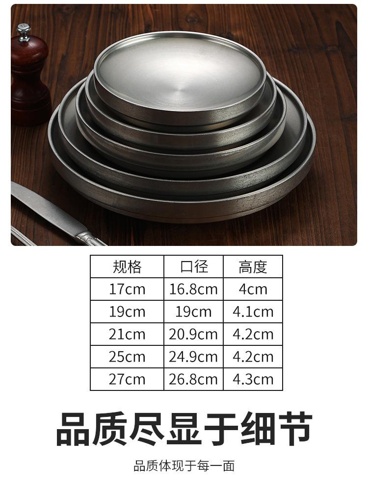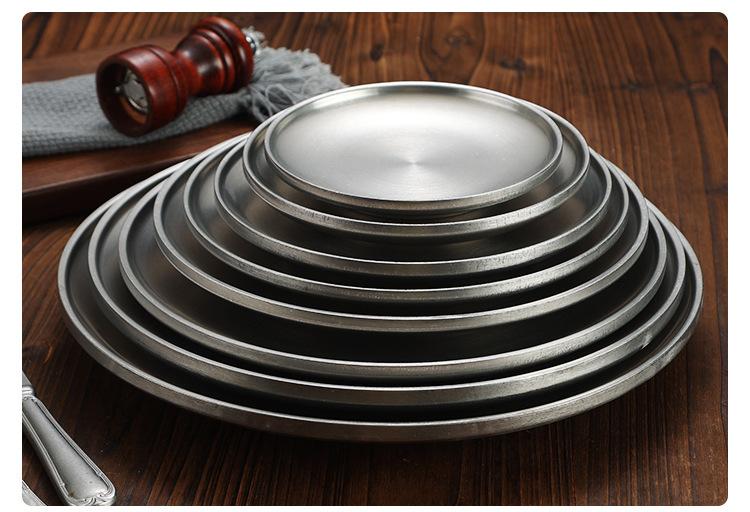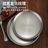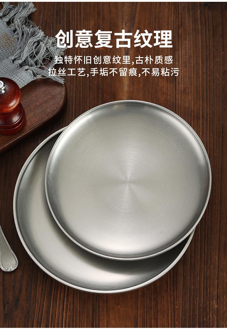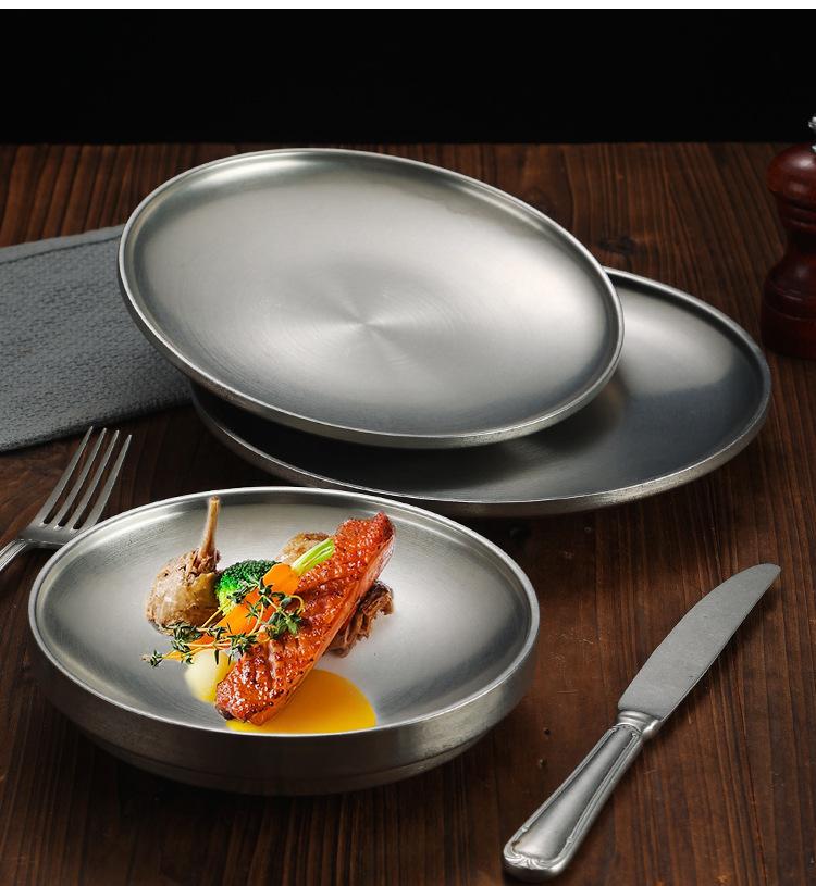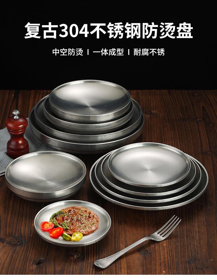 Plato vintage de acero inoxidable 304 de doble capa antiescaldamiento, plato antiguo, plato de fruta, plato plano, vajilla de barbacoa de estilo coreano.