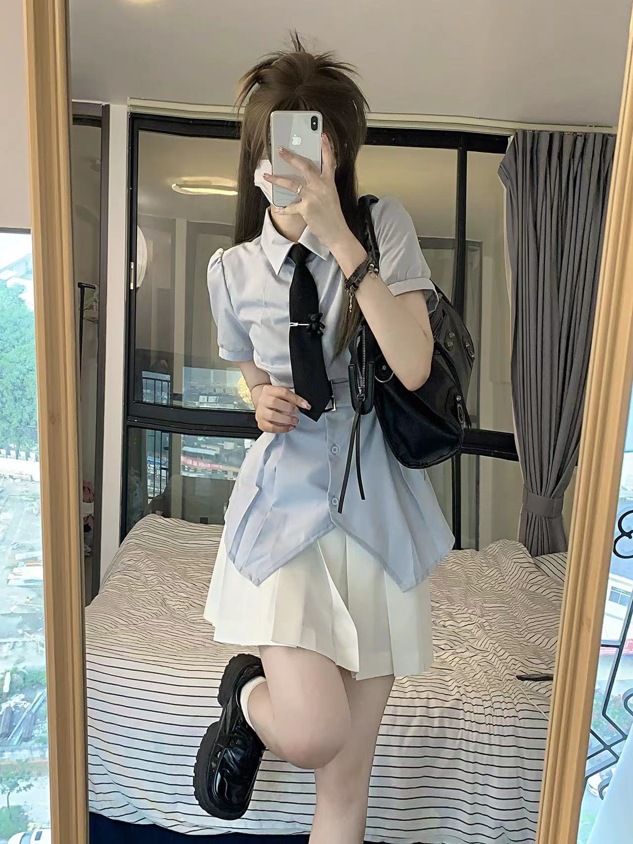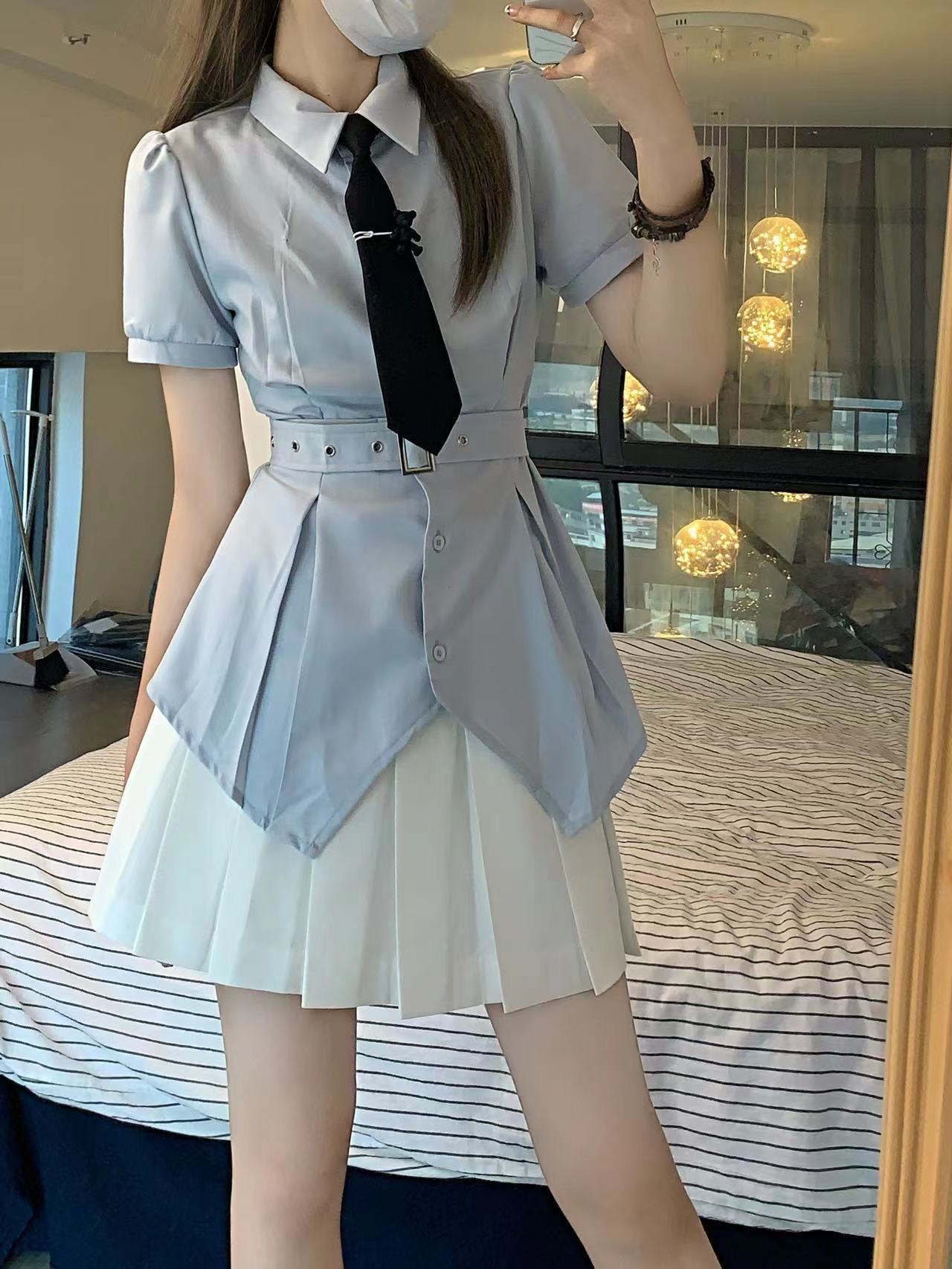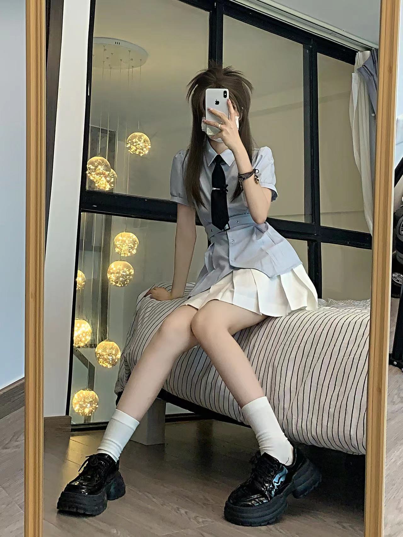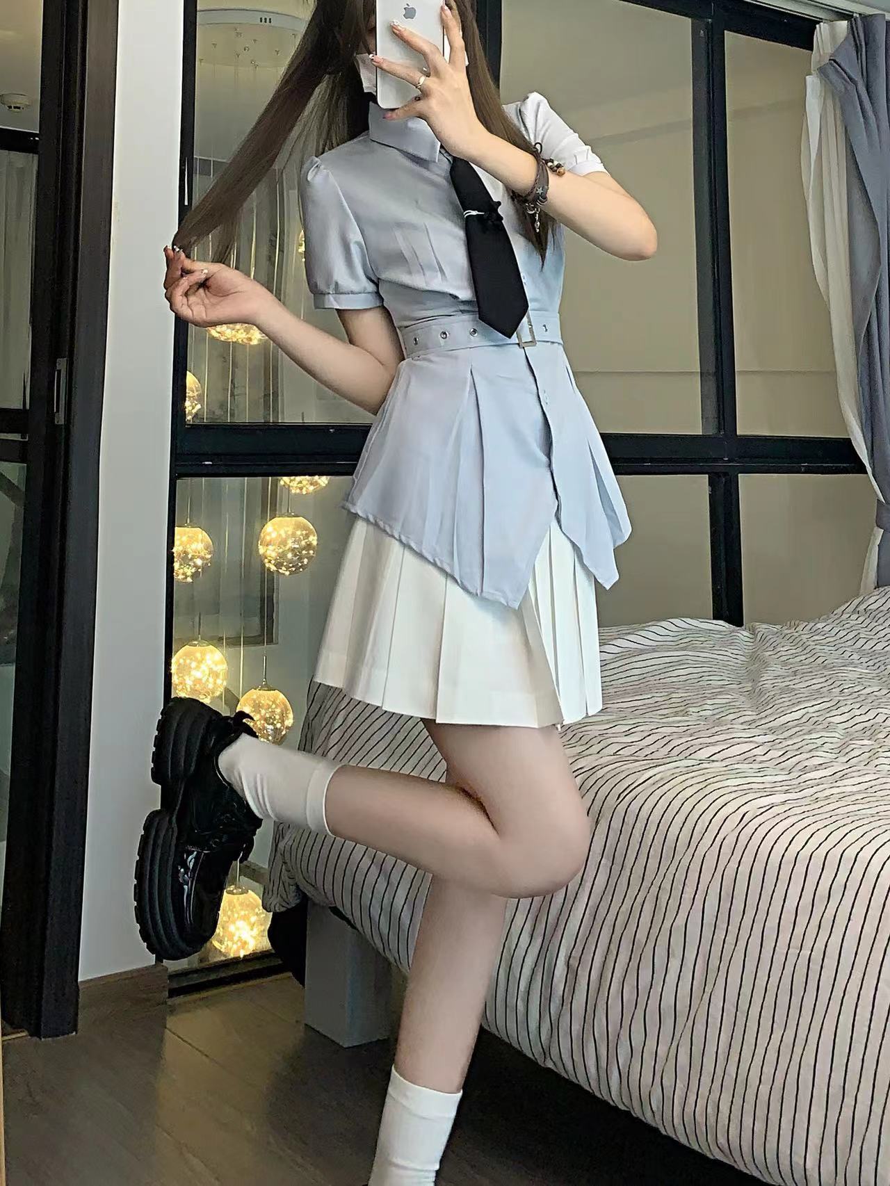 Foto real en el lugar azul agua camisa de cintura estilo universitario falda plisada set de uniforme jk