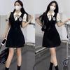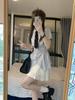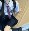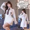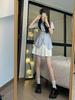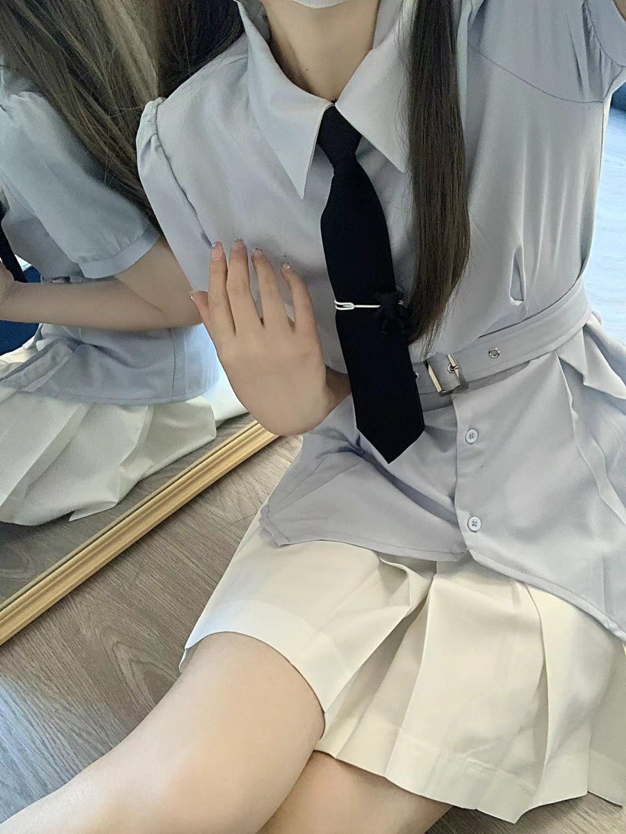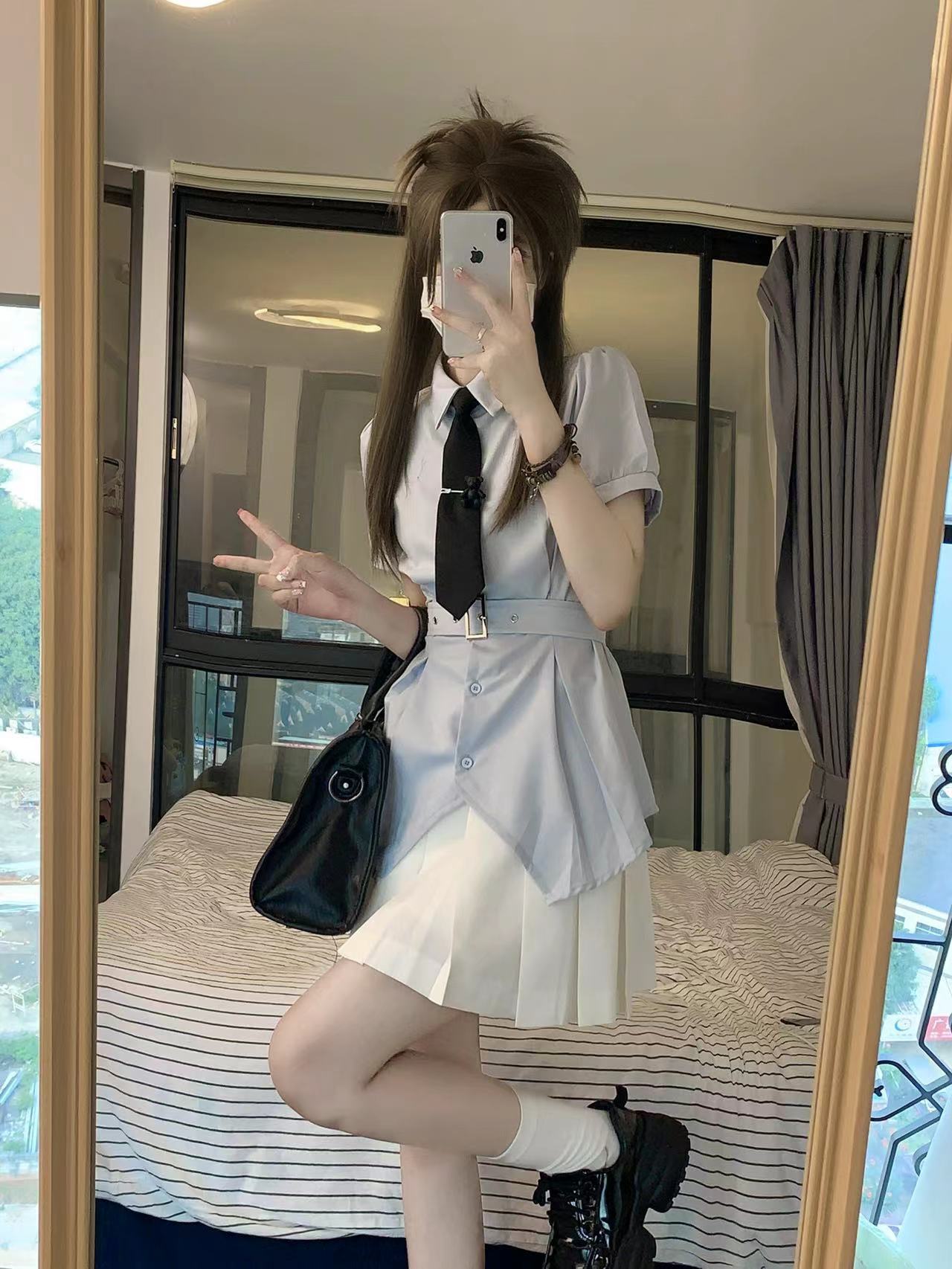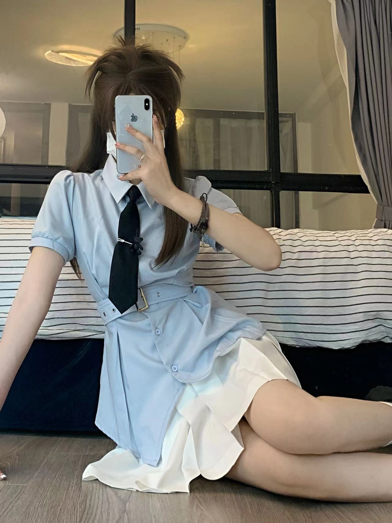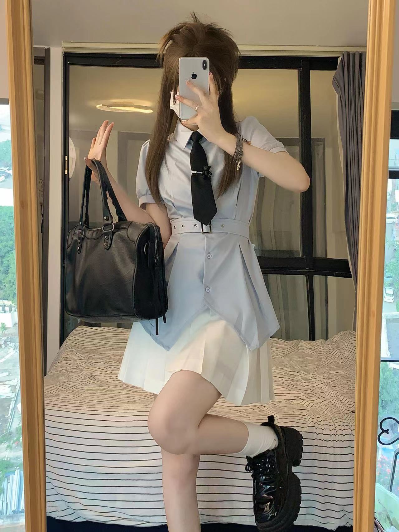 Foto real en el lugar azul agua camisa de cintura estilo universitario falda plisada set de uniforme jk