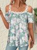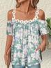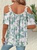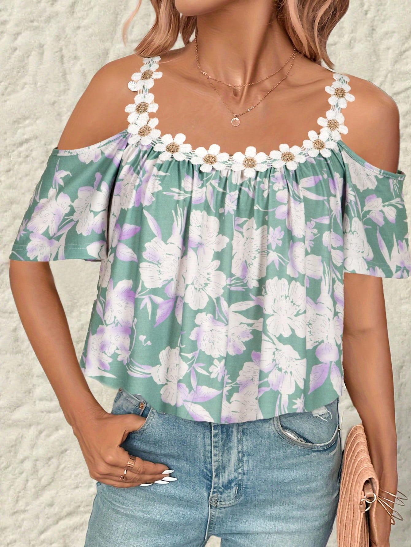 Nueva Ropa de Mujer de Amazon Estampado Floral Costuras Encaje Tirantes Cuello de un Hombro Camiseta de Manga Corta Top Descubierto