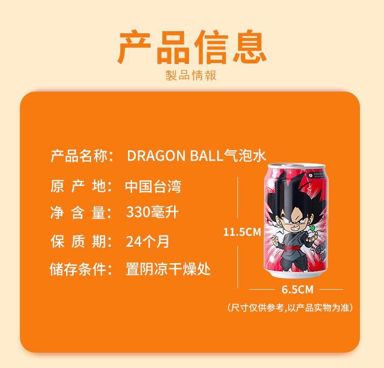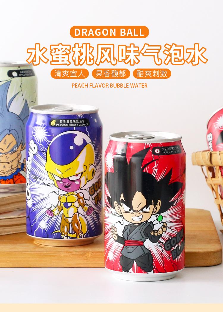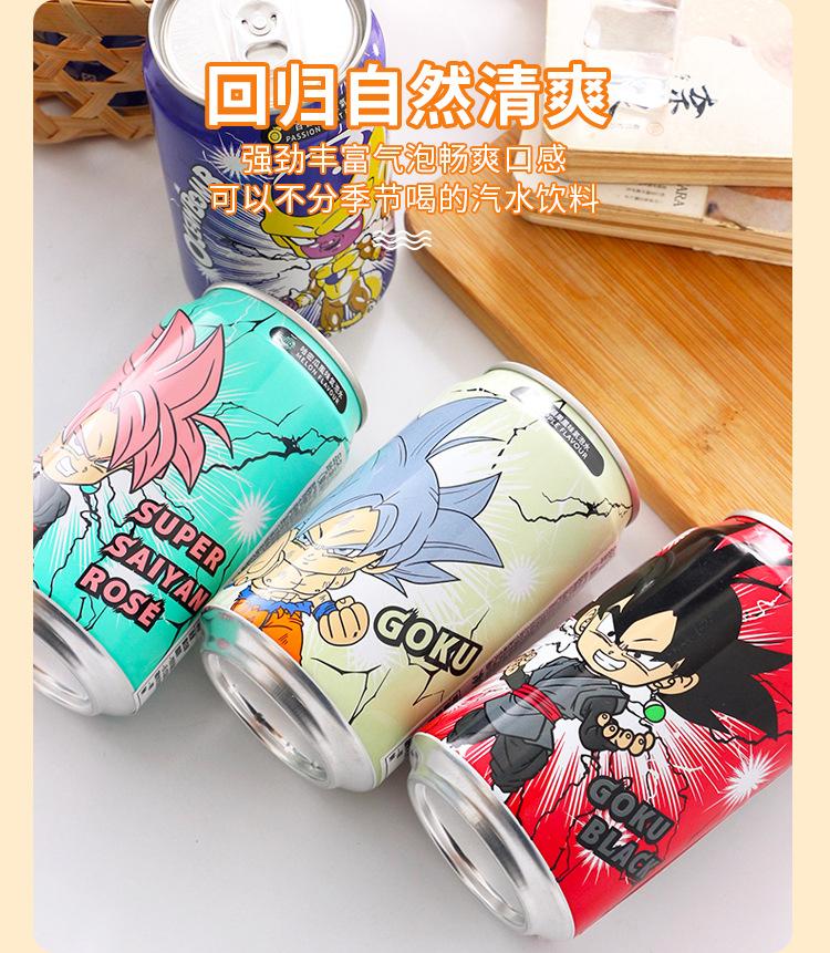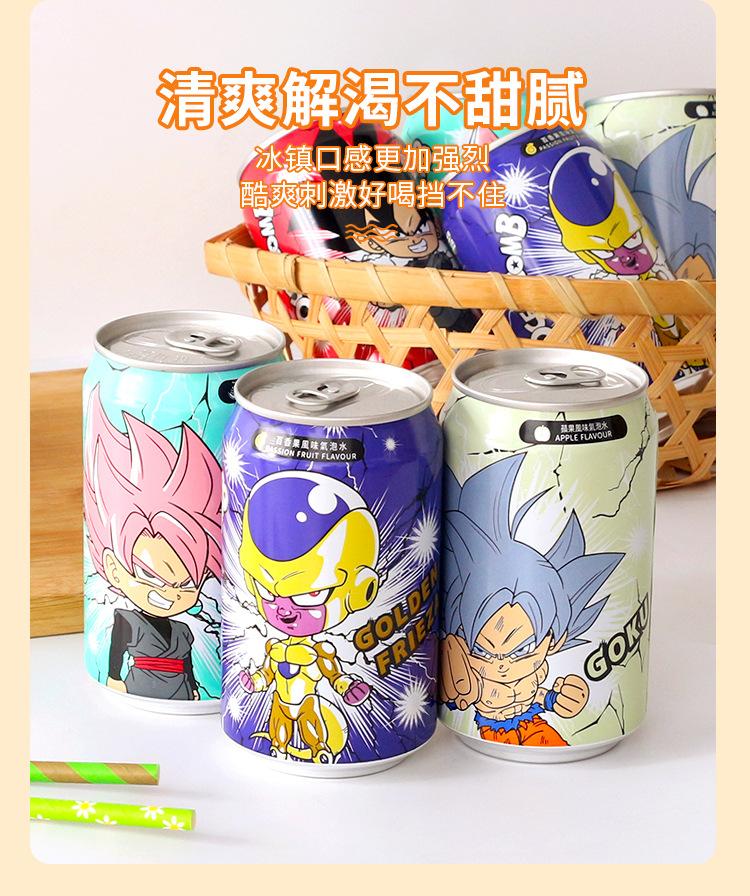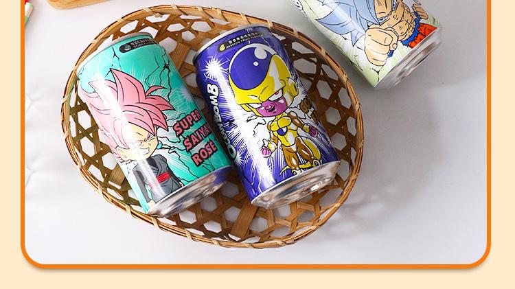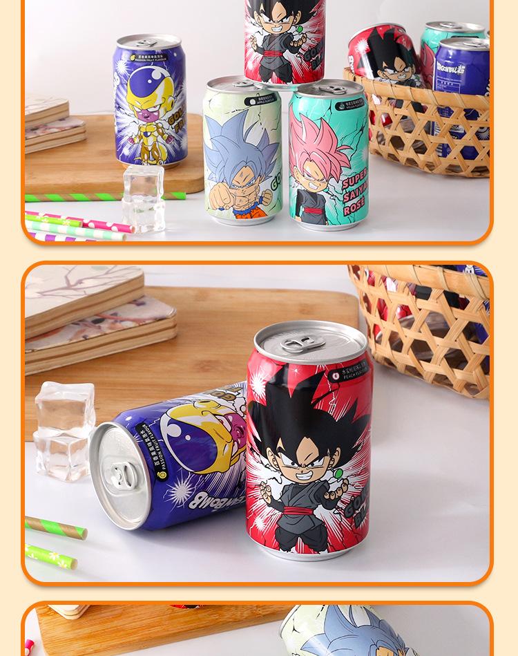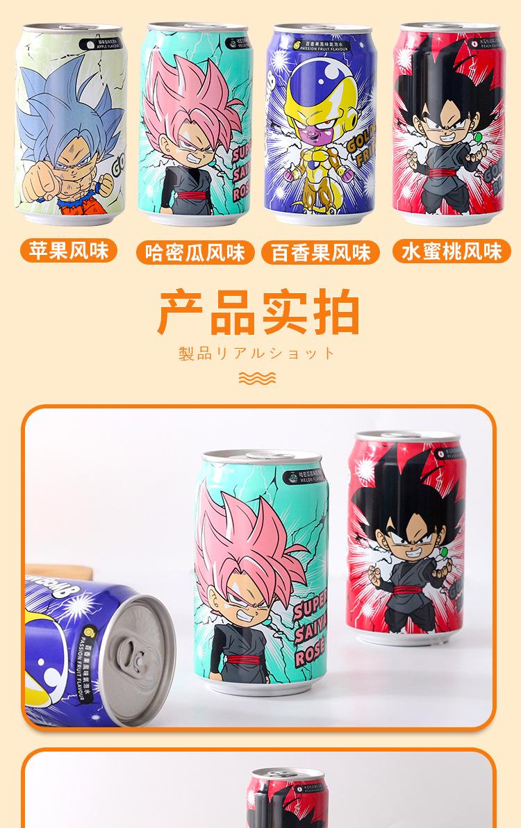 Venta al por mayor de refrigerios importados de Taiwán, bebida de agua con burbujas con nombre conjunto de dibujos animados de Dragon Ball, bebida carbonatada con sabor a fruta de celebridades de Internet