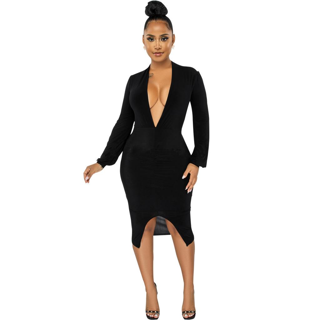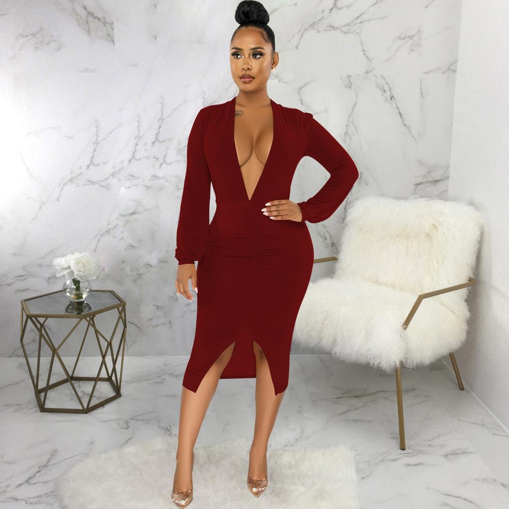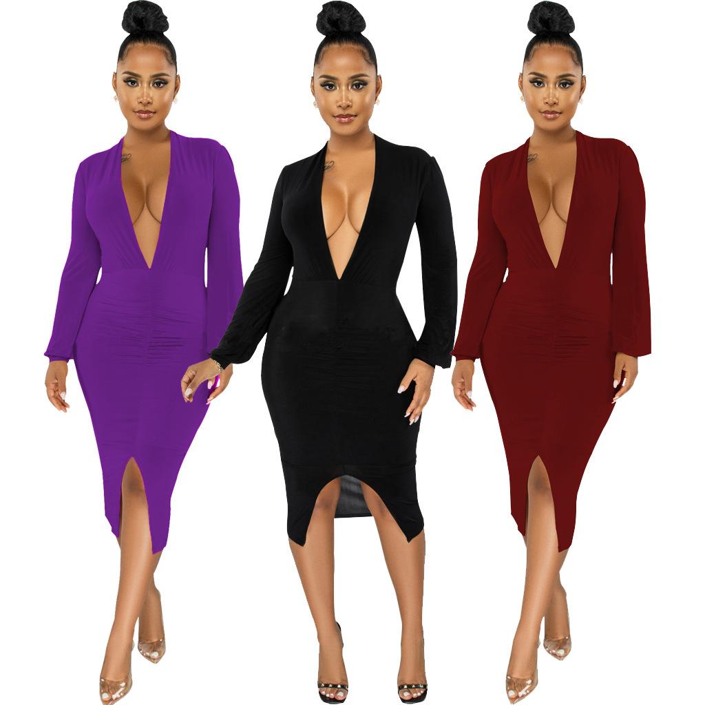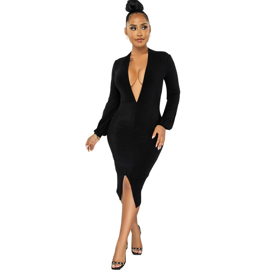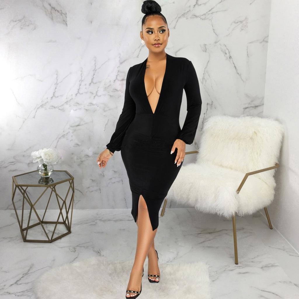 Compra Vestido de otoño e invierno 2022, Amazon, eBay, comercio exterior, ropa de mujer europea y americana, color sólido, sexy, con cuello en V. al por mayor en Joom.pro
