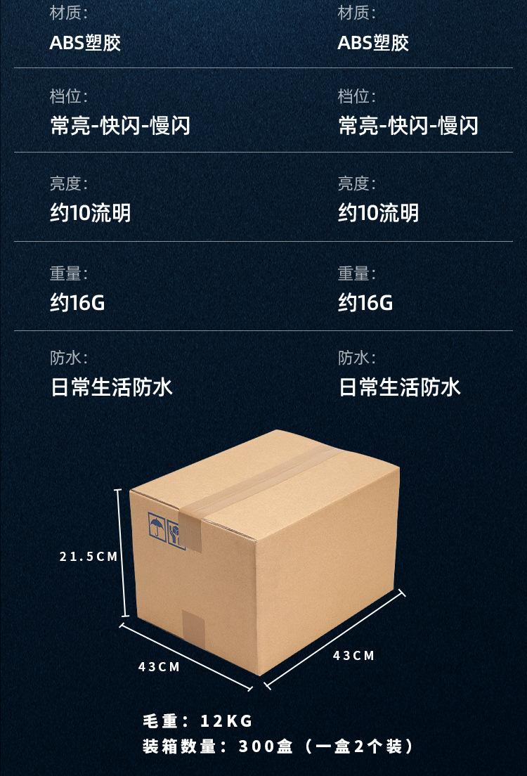 La versión de carga viene con 2 luces y un cable de carga.No hay empaque individual, el tamaño de la caja blanca es 4*4*6CM, 38g por caja300 cajas (600 piezas)Tamaño de la caja: 43*43*21.5CM 12kg