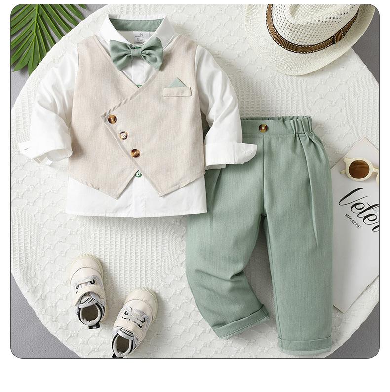 Fábrica de origen Traje pequeño europeo y americano de dos piezas ropa para niños bebé estilo primavera y otoño chaleco falso traje de niño de manga larga
