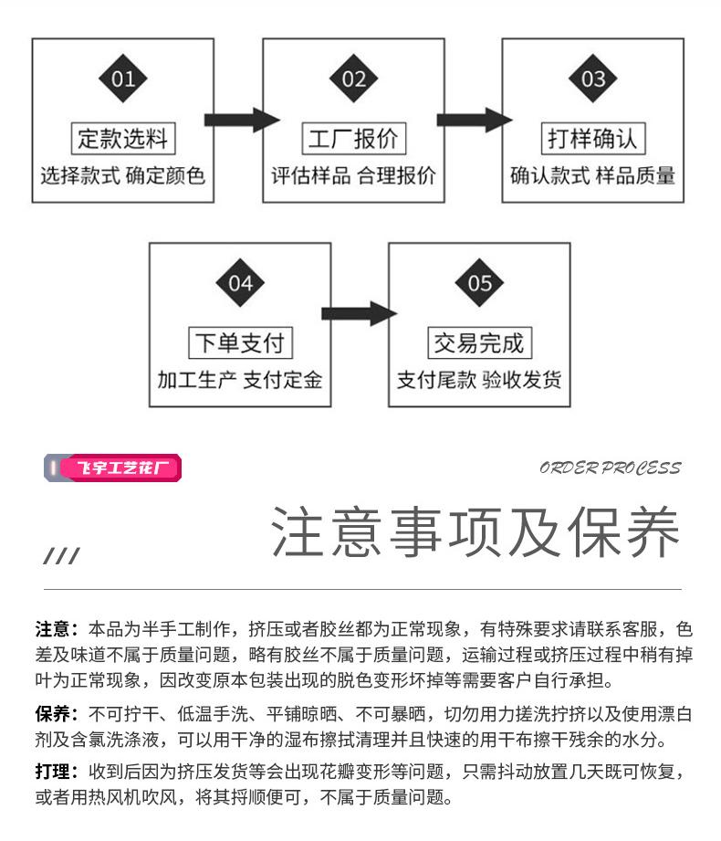 Estimados clientes, nuestra tienda fabrica, vende y vende al por mayor todo tipo de flores y plantas artificiales. En principio, vendemos artículos grandes, pero también ofrecemos muestras. Sin embargo, no se admiten devoluciones ni cambios de productos de muestra. Si compra solo uno o dos ejemplares de cada tipo, o si elige comprar uno o dos ejemplares de varios tipos, se considerará una muestra. No se aceptan reembolsos. Le recomendamos leer atentamente antes de realizar un pedido.