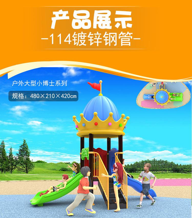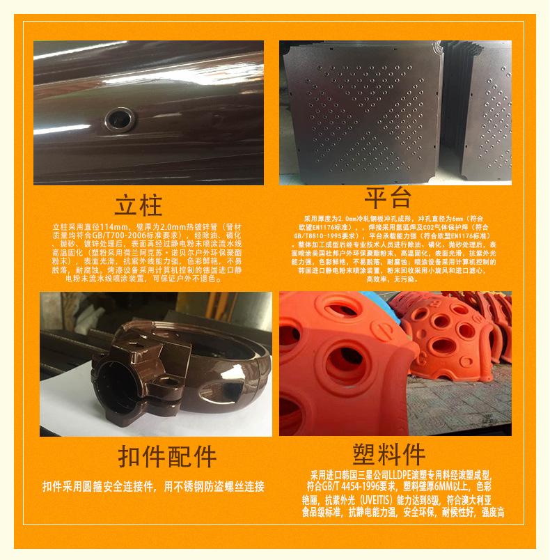 Tubo de acero galvanizado para columna de tobogán: 114 mm; espesor de columna: 2.0 mm. Plástico de ingeniería: LLDPE moldeo rotacional.