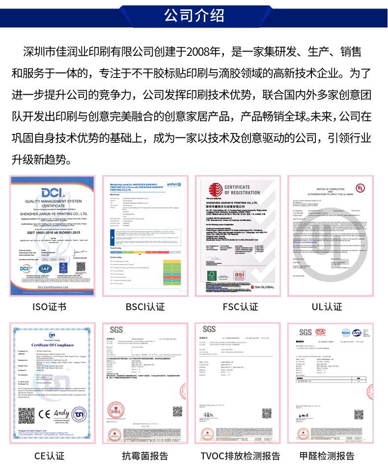 3: Se puede usar ampliamente en superficies en diferentes escenas. El pegamento tiene buena viscosidad y no se enrolla durante mucho tiempo. La tinta importada respetuosa con el medio ambiente no se decolora durante mucho tiempo. El equipo de impresión importado tiene colores reales y en capas. La superficie es impermeable, a prueba de aceite, a prueba de humedad, resistente a la corrosión, resistente a altas temperaturas y no tiene olor acre.
