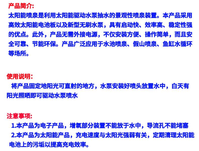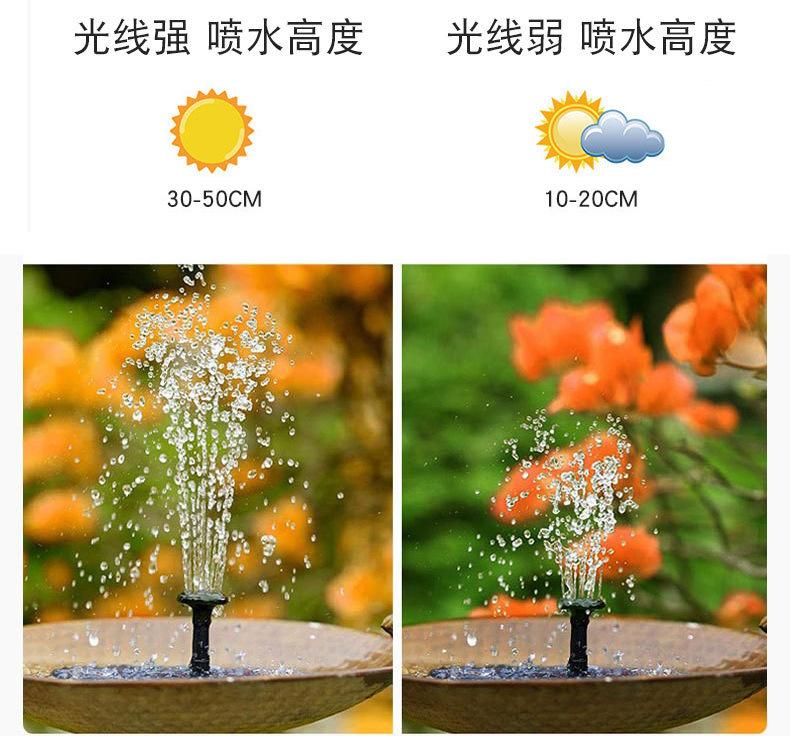 1) Este producto utiliza una bomba de agua de accionamiento directo, que solo puede rociar agua continuamente cuando hay suficiente luz solar; cuando hay luz solar insuficiente, puede que no rocíe agua o que rocíe agua intermitentemente. Además, dado que la eficiencia de los paneles solares se ve afectada por la intensidad de la luz, el efecto de rociado de agua de la fuente también se verá afectado por las condiciones climáticas, los cambios estacionales, la ubicación geográfica y otros factores.