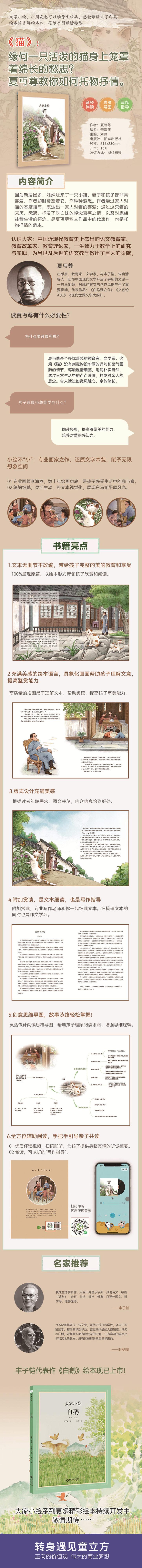 La serie de libros ilustrados "Da Jia Xiao Hui" selecciona artículos clásicos incluidos en los libros de texto chinos y utiliza acuarelas pintadas a mano para reproducir las obras de maestros literarios, con el objetivo de transmitir valores clásicos a los niños contemporáneos, para que los sentimientos de los maestros puedan calentar y enriquecer el mundo de generaciones de niños. "Gato" es uno de los libros ilustrados de la serie "Da Jia Xiao Hui". La obra describe la personalidad excéntrica del gato y su picardía cuando hay luna llena con detalle y vívidamente, creando un reino de confianza mutua y coexistencia armoniosa entre personas y gatos, expresando el sentido de justicia, la compasión y el análisis estricto de sus pensamientos y sentimientos internos por parte del autor, destacando el tema de la tolerancia, la benevolencia, la simpatía y la ayuda a los débiles. Este libro está pintado a mano con acuarelas por un ilustrador de renombre, dando a los lectores una sensación inmersiva.