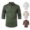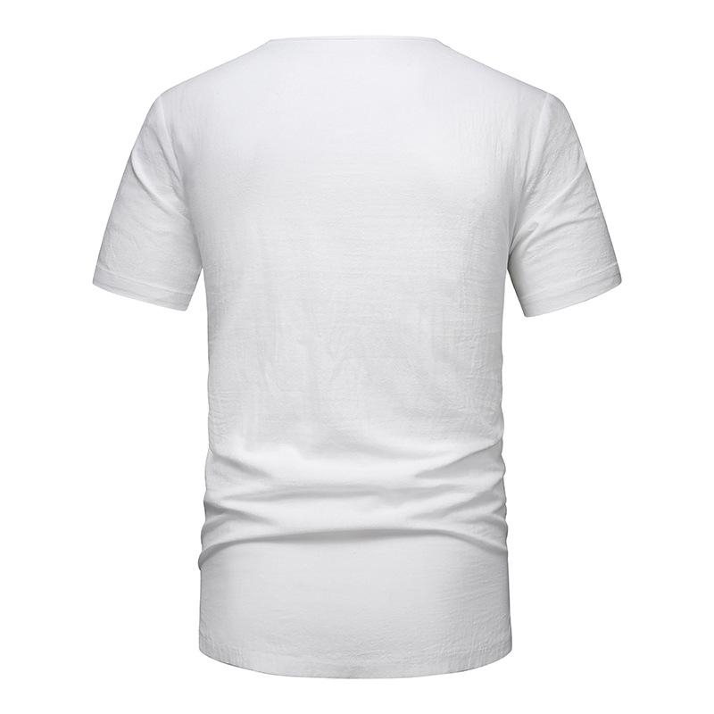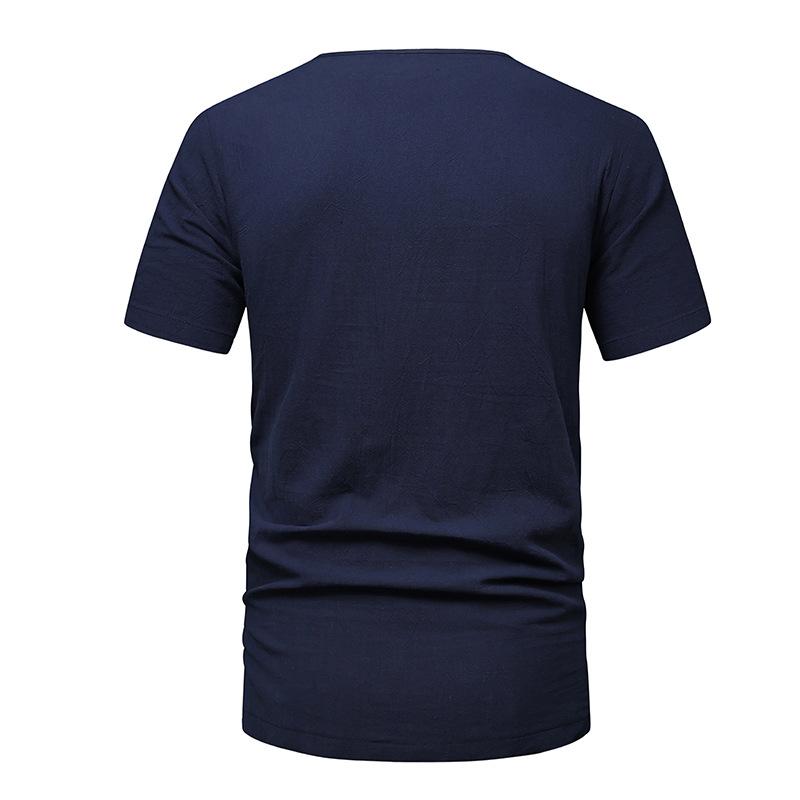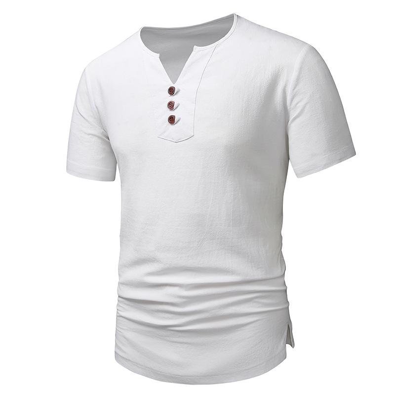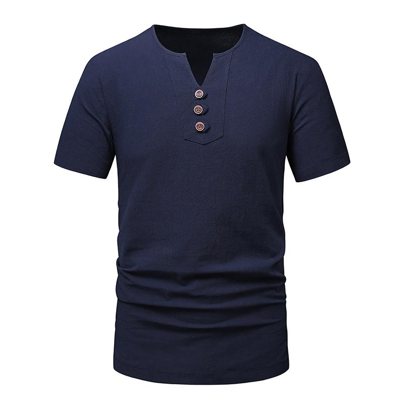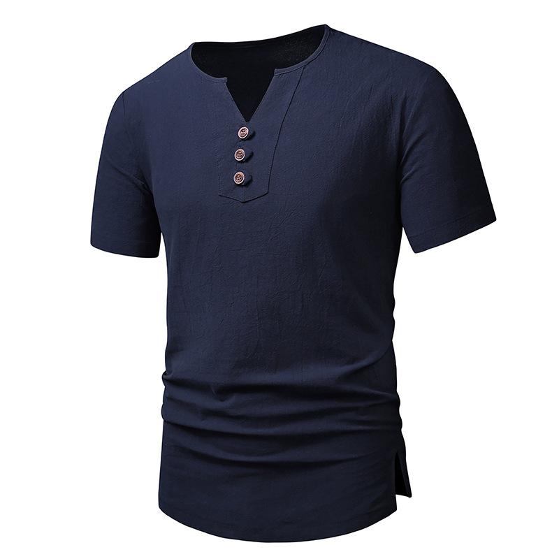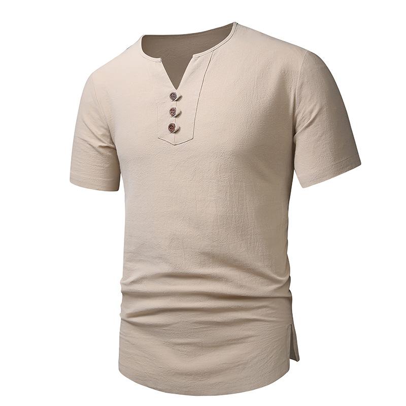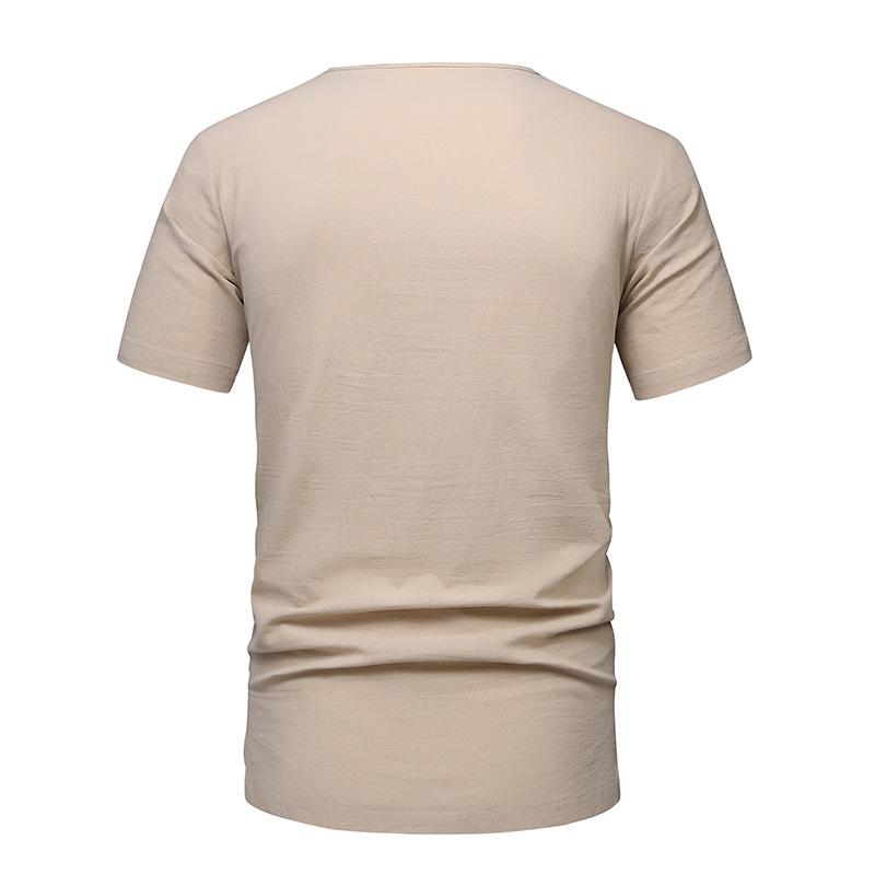 23 comercio exterior nuevo Amazon Camiseta de playa de algodón y lino con cuello en V para hombre, transfronteriza, retro, color sólido, casual, camisa de tres botones