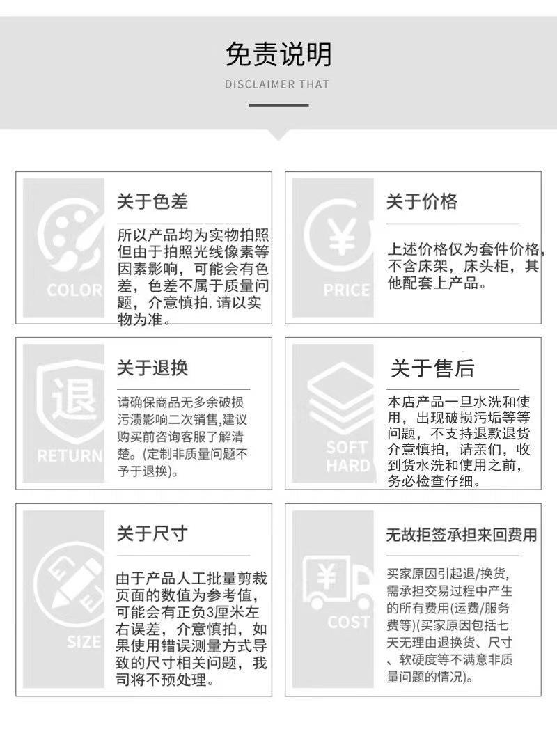Recordatorio: Debido al alto costo de la ropa de cama textil para el hogar, no se realizarán reembolsos ni cambios después del lavado por ningún motivo. ¡Por favor, revísela cuidadosamente antes de usarla después de recibirla! Queridos amigos a quienes les importe, ¡por favor, considérelo cuidadosamente antes de hacer su pedido! Es normal que la ropa de cama oscura tenga un poco de color flotante al lavarla por primera vez. Después de uno o dos lavados, esto desaparecerá y podrá usarla con confianza. Puede haber un margen de error de más o menos 3 cm en la ropa de cama cortada a mano, lo cual es normal y no representa un problema de calidad.