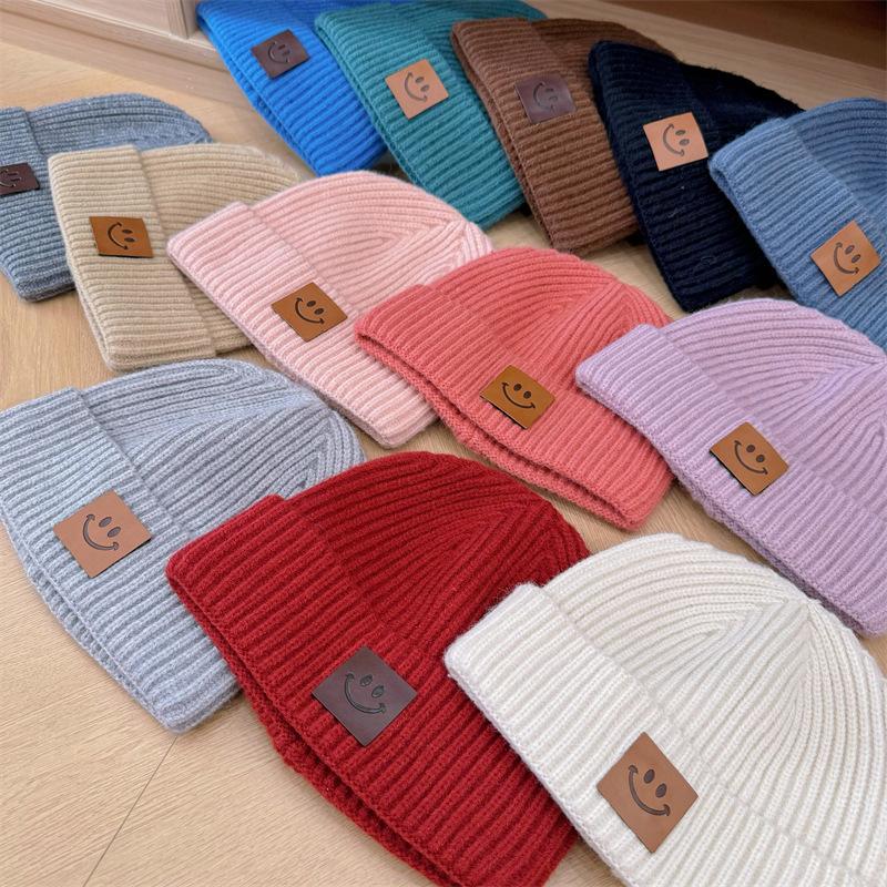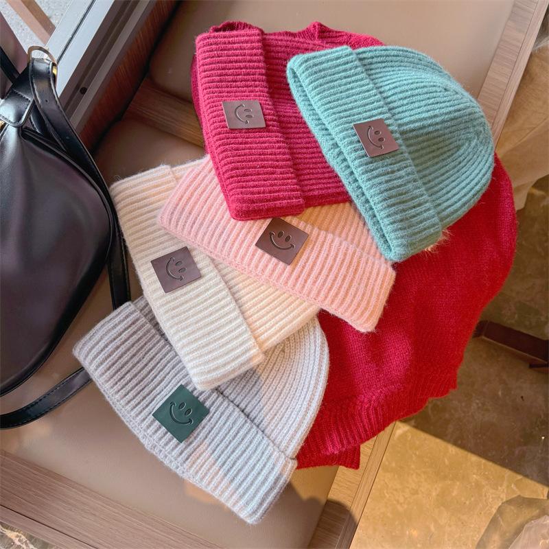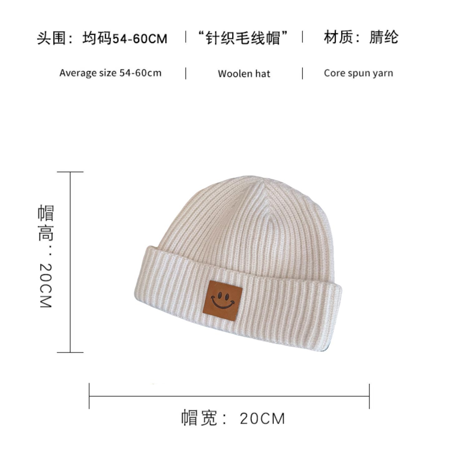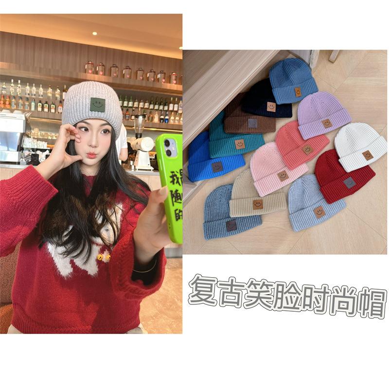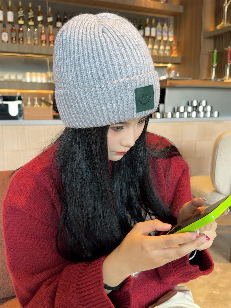 Gorro de lana para mujer, otoño e invierno, japonés, moderno, grande, para la cabeza, pequeño, cálido, protector de orejas, resistente al frío, combinable, gorro de punto con cara sonriente.