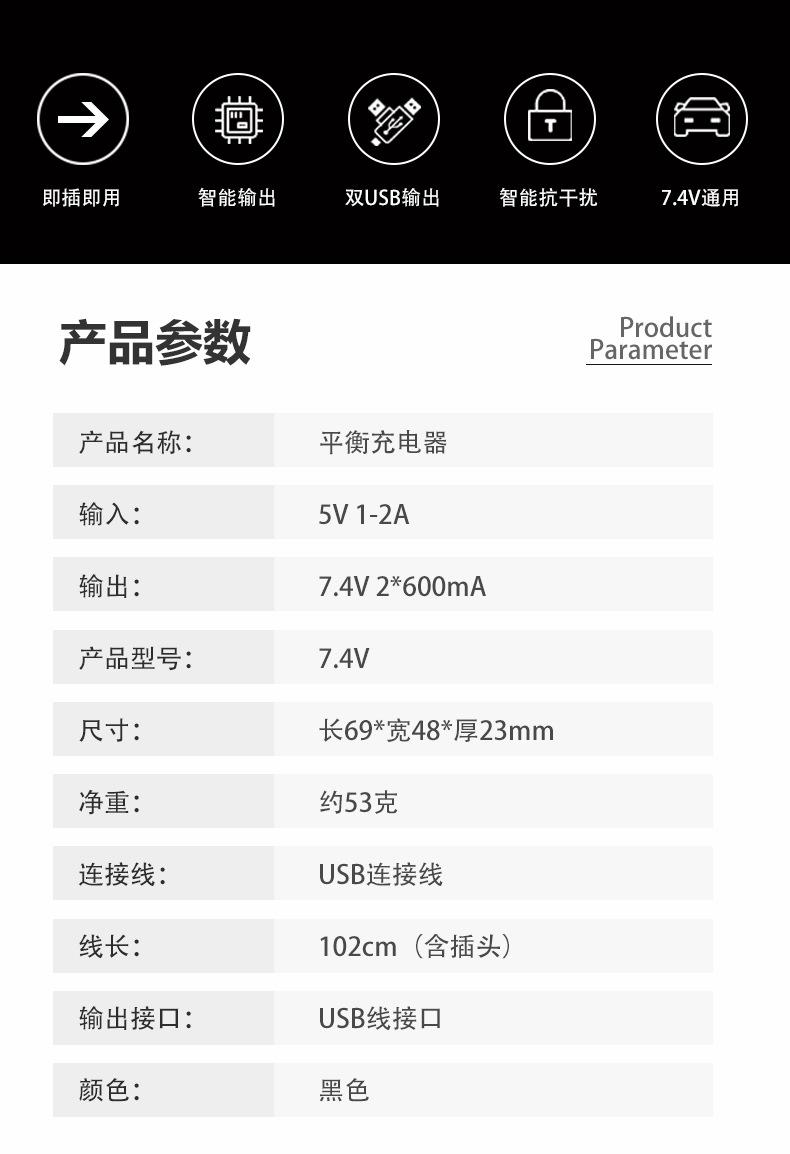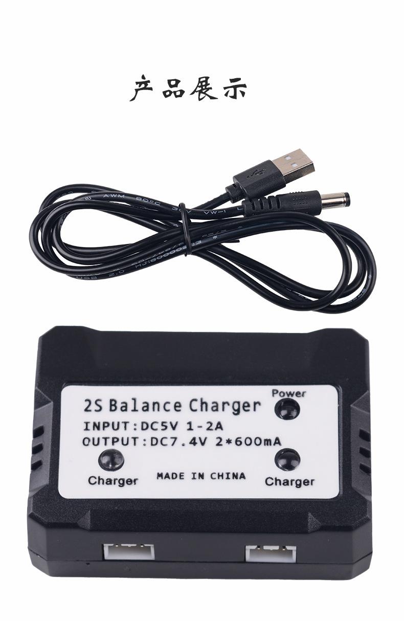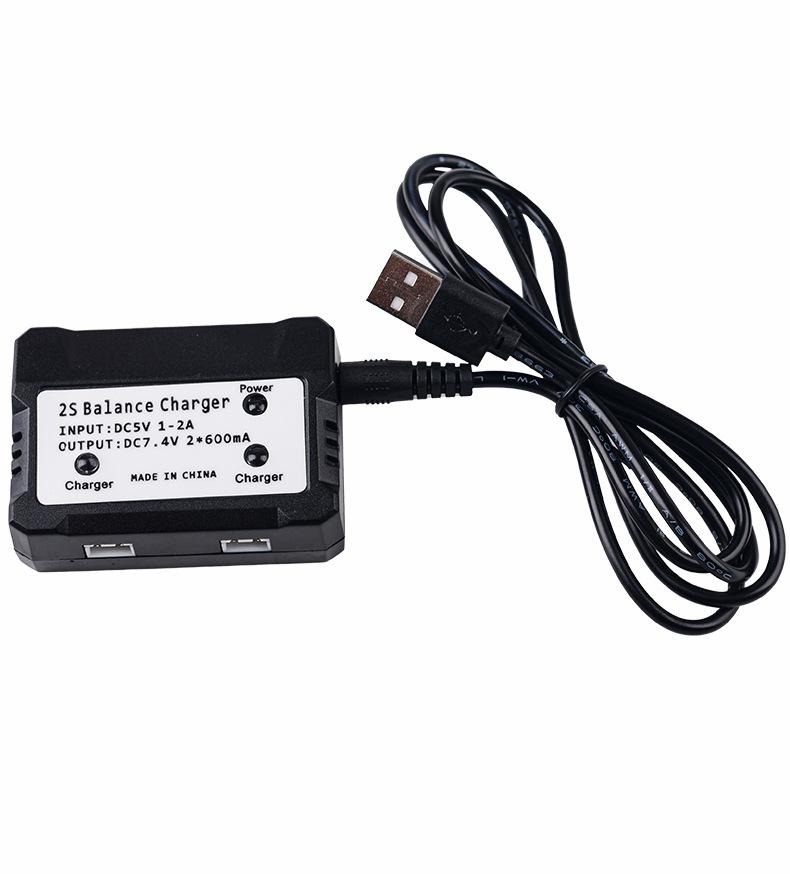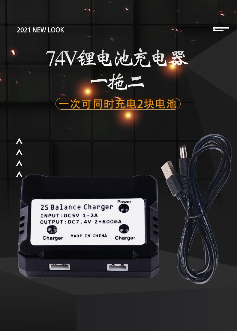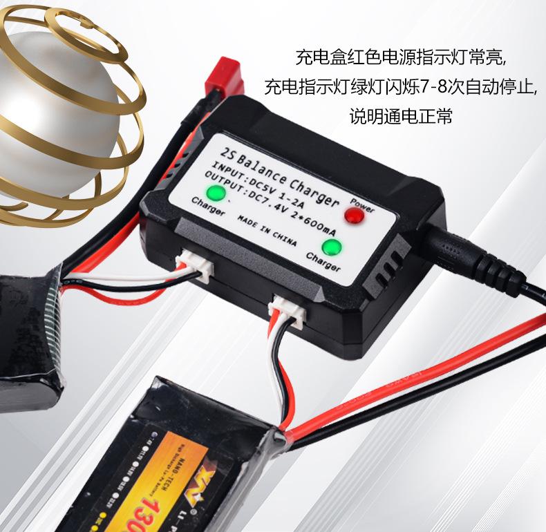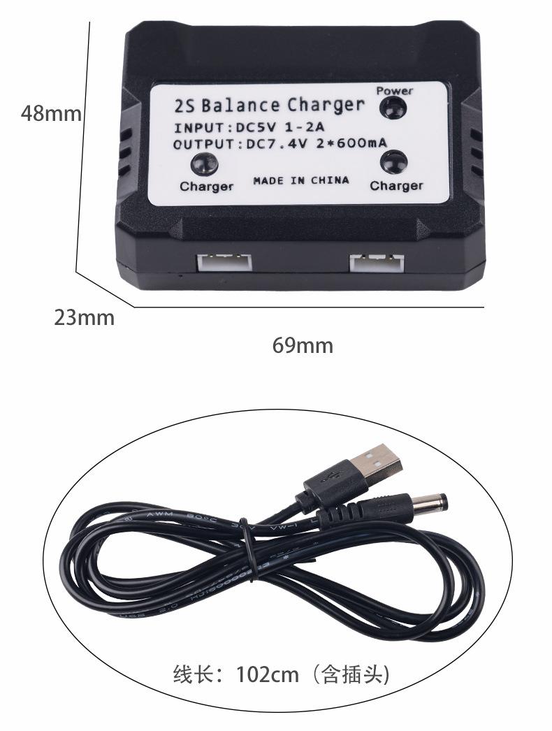 Cargador de equilibrio de batería de litio con pin de fábrica de 7,4 V, modelo uno, arrastre dos, protección contra sobrecarga, luz de giro de potencia máxima, línea de carga USB