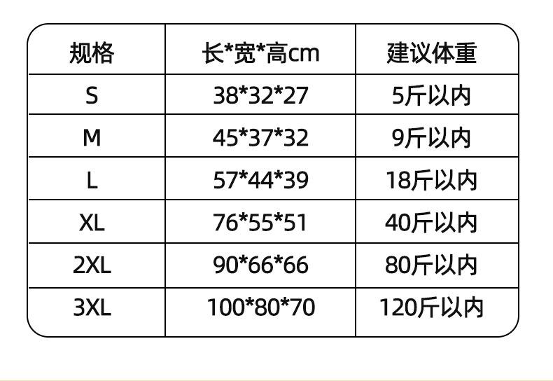 S size: 38*32*27cm, M size: 45*37*32cm, L size: 57*44*39cm, Xl size: 76*55*51cm, Size 2xl: 90*66*66cm, Size 3xl: 100*80*70cm