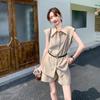 Pantalones casuales de pierna ancha de color caqui sin mangas con cordón ajustable para mujer de verano 2024, nuevo estilo europeo y americano