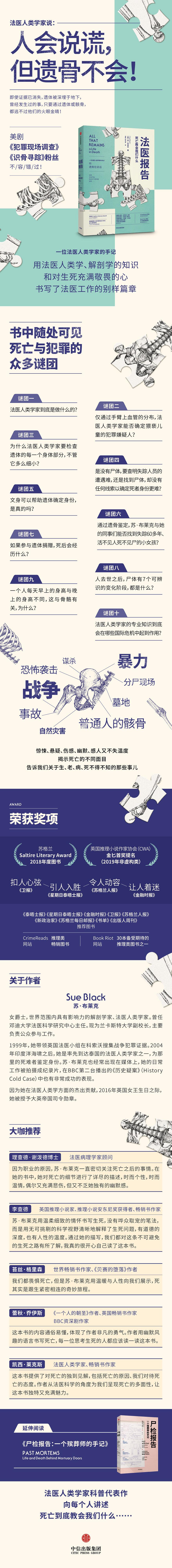 Sue Black se enfrenta a la muerte todos los días. Como antropóloga forense, examina los esqueletos de personas comunes en el laboratorio, cementerios, violencia, asesinato, desmembramiento y muertes en masa causadas por guerras, accidentes o desastres naturales. En este libro, revela los diferentes rostros de la muerte que ha presenciado, explora el desarrollo y progreso de la medicina forense a través de casos reales en los que ha participado y revela el impacto y las perspectivas de la antropología forense en su trabajo y vida. La gente siempre piensa que los libros sobre la muerte harán que la gente se sienta triste u horrorizada, pero este libro es diferente. Hay historias trágicas, historias humorísticas y casos reales como novelas de suspense. Aunque no puede hacernos comprender todos los rostros de la muerte, como testigo experto en la primera línea de la muerte, Sue Black es una guía más inteligente, fiable y convincente.
