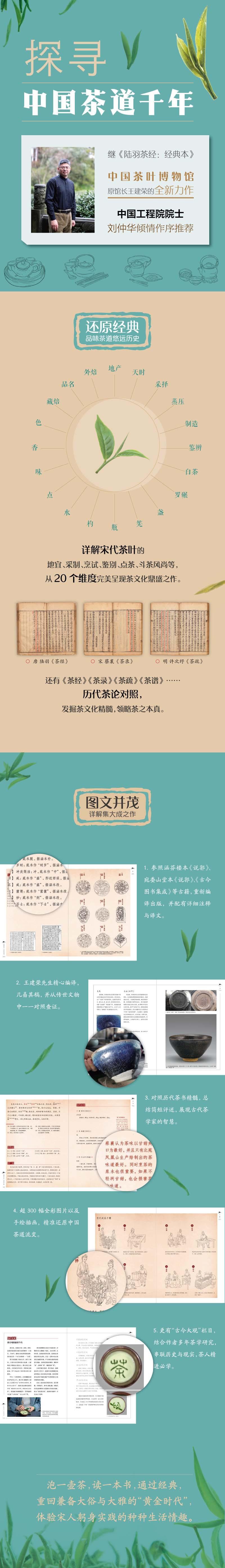 Una gran visión de los libros de té a través de los tiempos, que aclara la evolución de la ceremonia del té. Correspondiente a la plantación del árbol del té, la producción de té y la identificación de productos de té en la dinastía Song del Norte, el autor "viaja" a través de miles de años y selecciona monografías de ciencia del té publicadas en las dinastías pasadas para mostrar la evolución de las técnicas de la ceremonia del té en diferentes períodos.