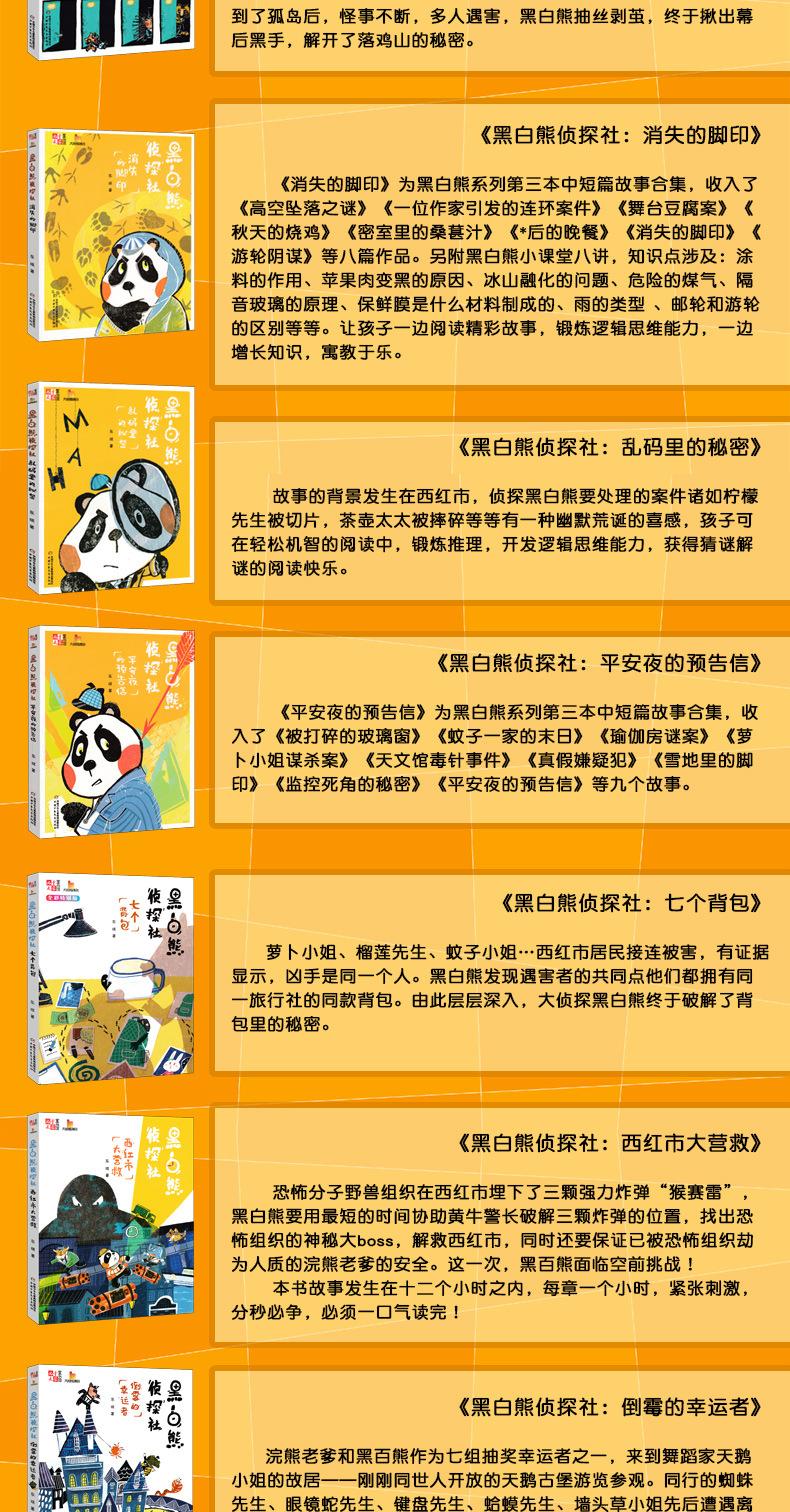 "Huellas Desaparecidas": Este libro es uno de la serie "Agencia de Detectives Oso Blanco y Negro". Oso Blanco y Negro, que parece un panda pero no es un panda, vive en Ciudad Xihong con su padre adoptivo, Padre Mapache, y dirigen juntos una agencia de detectives. En el proceso de buscar su verdadera identidad, Oso Blanco y Negro resuelve un caso de suspense tras otro.