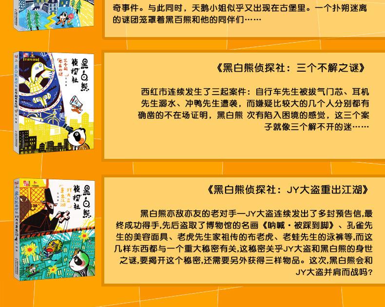 "Tres Misterios Irresolubles": Este es el noveno libro de la serie Oso Blanco y Negro y la quinta novela. Oso Blanco y Negro parece un panda pero no es un panda. Ha perdido la memoria y solo sabe que ha sido transformado por una misteriosa fábrica subterránea. Ahora vive en Ciudad Xihong con su padre adoptivo, Padre Mapache, y juntos dirigen una agencia de detectives. En el proceso de buscar su verdadera identidad, Oso Blanco y Negro resuelve un caso de suspense tras otro.