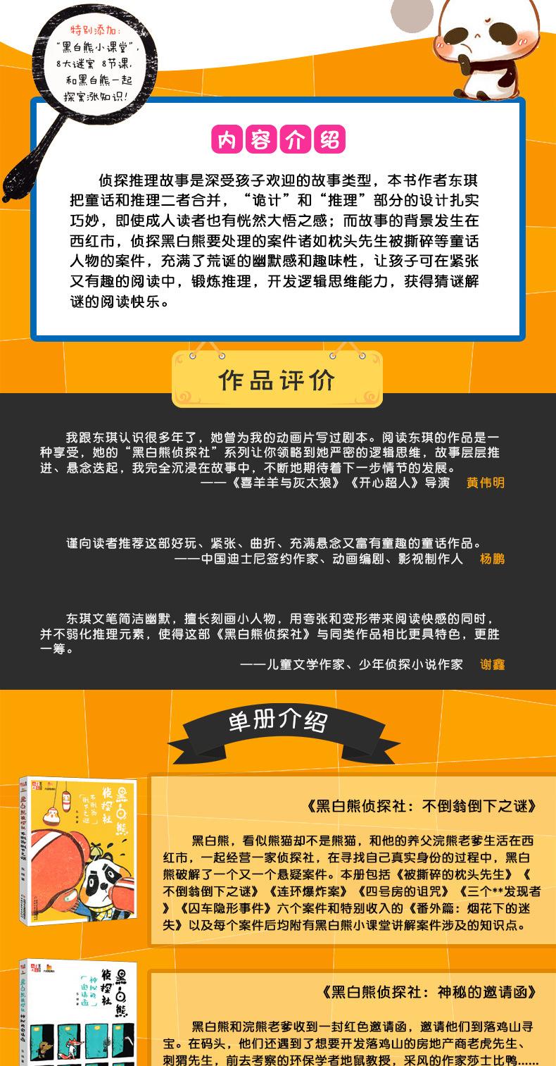 """Invitación Misteriosa": Este libro es uno de la "Serie de la Agencia de Detectives Oso Blanco y Negro". Oso Blanco y Negro, que parece un panda pero no es un panda, vive en Ciudad Xihong con su padre adoptivo, Padre Mapache, y dirigen una agencia de detectives juntos. En el proceso de encontrar su verdadera identidad, Oso Blanco y Negro resuelve un caso de suspense tras otro. Este libro es una historia larga: Oso Blanco y Negro y Padre Mapache recibieron una carta de invitación roja, invitándolos a ir a buscar un tesoro en la Montaña Luoji. En el muelle, también conocieron al Sr. Tigre y al Sr. Erizo, promotores inmobiliarios que querían desarrollar la Montaña Luoji, al Profesor Tuza, un estudioso ambiental que fue a investigar, y a Pato Shakespeare, un escritor que fue a recopilar canciones populares... Después de llegar a la isla aislada, sucedieron cosas extrañas una tras otra, y muchas personas fueron asesinadas. Oso Blanco y Negro desentrañó el misterio y finalmente encontró al cerebro detrás de escena y resolvió el secreto de la Montaña Luoji."